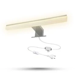 Lampe à miroir LED Birkos fine en aluminium et acryliqueLa lampe à miroir Birkos est fabriquée en aluminium et en acrylique et possède des LED fixes qui génèrent un éclairage blanc chaud. Elle possède le type de protection IP44 et convient donc parfaitement à une salle de bains. Elle est dotée d’un interrupteur à câble qui permet de l’allumer et de l’éteindre facilement. Son corps chromé s’intègre bien dans l’ambiance des salles de bains et apporte une touche de modernité.