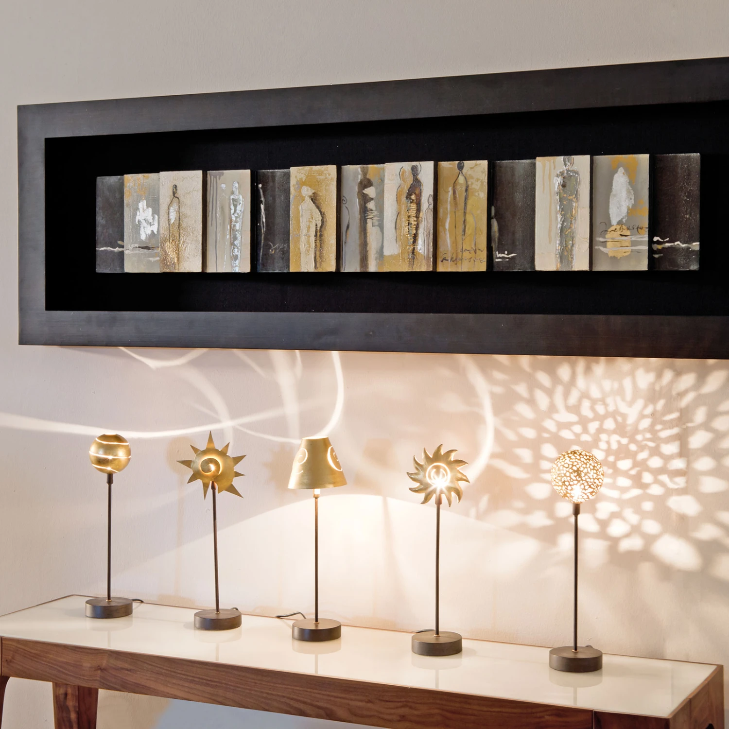 La lampe à poser SONNE GOLD impressionne particulièrement par ses effets lumineux : au premier regard on apperçoit l’abat-jour en forme de soleil et lorsque la lumière est en marche, elle projète sur le mur un éclairage en forme de lune. L’harmonieuse combinaison de fer brun et doré accentue le côté décoratif de la lampe.