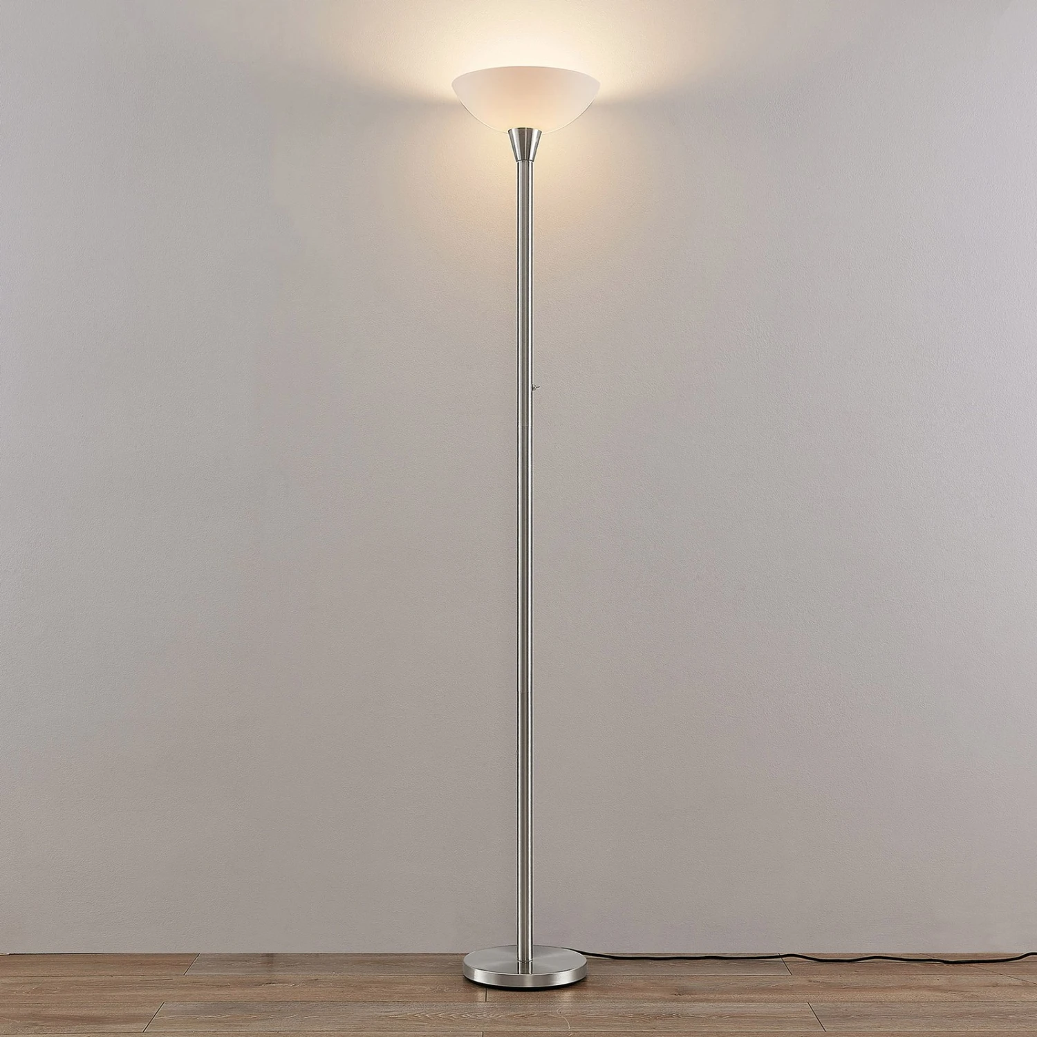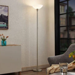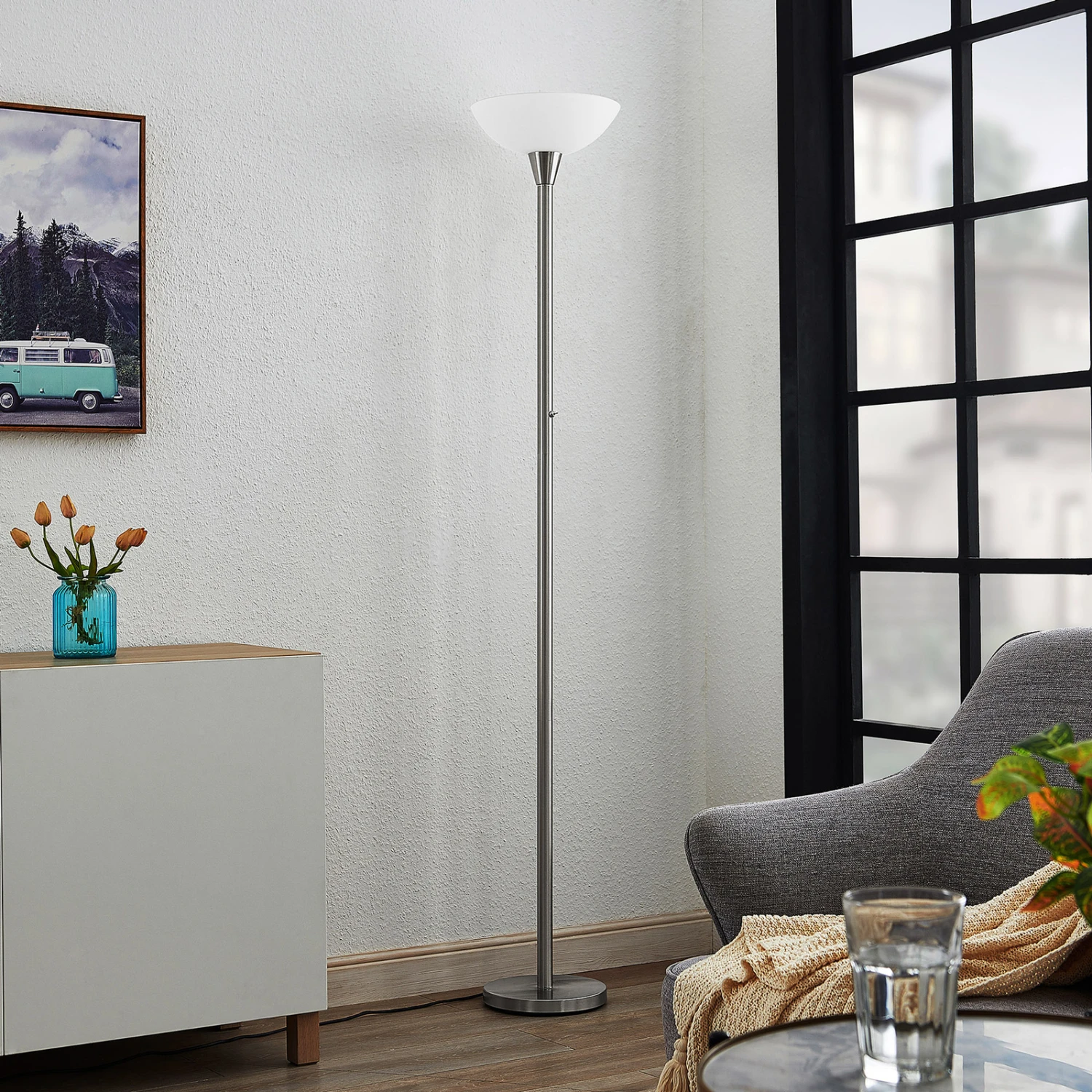 Lampadaire élancé Tariola avec diffusion de lumière sans éblouissementLe lampadaire Tariola est un plafonnier pratique au design couleur nickel. La structure fine ne prend pas beaucoup de place dans la pièce et se combine à merveille avec différents concepts de couleurs grâce à sa couleur neutre. L’abat-jour ouvert vers le haut est fabriqué en verre blanc opale et diffuse la lumière dans la pièce sans aucun éblouissement. Ce luminaire pratique se commande aisément à l’aide d’un interrupteur pratique situé sur le support et crée une ambiance agréable dans la pièce.