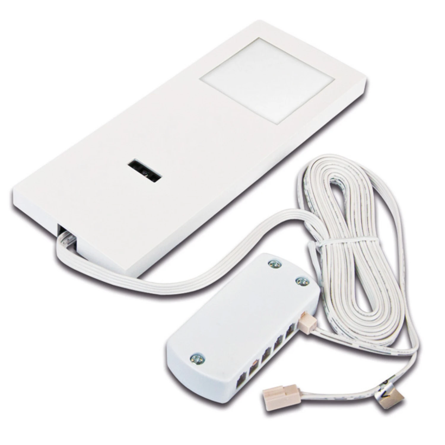 Le luminaire au corps rectangulaire en plastique, qui contient de puissantes LED d’une durée de vie de 60 000 heures, peut être facilement réglé en luminosité grâce au gradateur IR sans contact intégré. La fonction de mémoire permet de conserver les réglages de luminosité individuels même après la mise hors tension. Le luminaire sous l’armoire fournit une lumière de surface homogène qui éclaire le plan de travail dans la cuisine ou met habilement en scène les étagères dans le salon.