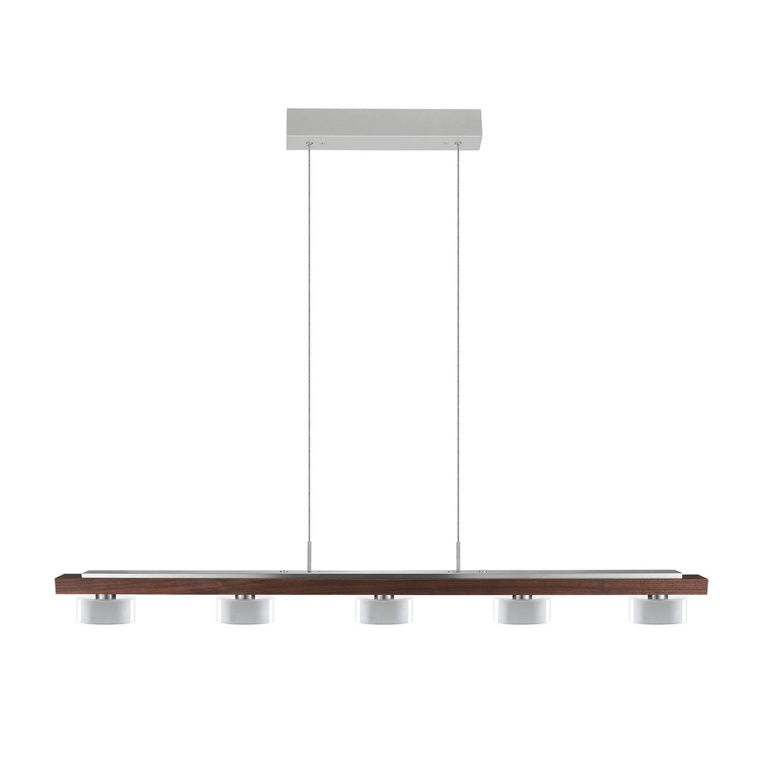 Suspension LED Estelle avec poutres en bois et abat-jour en verre, rayonnant vers le haut et vers le basLe luminaire suspendu LED Estelle allie à la perfection design moderne et rayonnement naturel. Le baldaquin ainsi qu’une baguette sur la suspension en bois sont fabriqués en nickel brossé mat, auxquels s’ajoutent cinq abat-jour en verre opale orientés vers le bas. Les deux câbles peuvent être raccourcis avant le montage ; en outre, la hauteur de la suspension peut être ajustée ultérieurement. L’intensité lumineuse des DEL orientées vers le bas dans les abat-jour en verre ainsi que celle de l’éclairage supérieur sur la partie supérieure de la barre peuvent être réglées séparément à l’aide de deux capteurs tactiles sur la barre – bois issu de forêts gérées durablement provenant de fournisseurs certifiés FSC – bon rendu des couleurs : CRI > 90 – dim-to-warm : la variation de l’intensité lumineuse modifie la couleur de la lumière – blanc universel en cas de forte production de lumière, blanc chaud en cas de faible production de lumière – fabrication en Allemagne