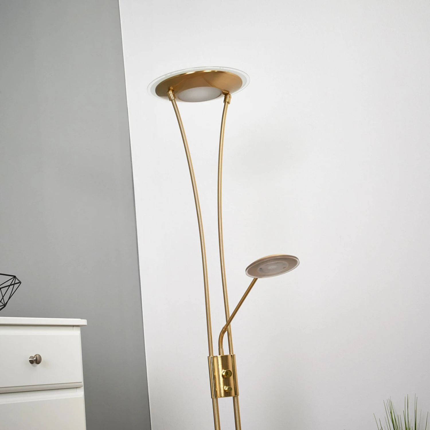 Lampadaire LED couleur laiton Eda avec variateur intégréEda est un lampadaire LED qui, avec sa finition couleur laiton, apporte une touche noble et classique. Le projecteur est particulièrement présent, il est orienté vers le haut et assure une lumière confortable avec un effet indirect. En outre, le lampadaire LED dispose d’une lampe de lecture qui se présente sous la forme d’un bras partant du centre de la structure et dont l’orientation peut être adaptée grâce aux éléments flexibles. Il est ainsi possible de répondre à différents besoins et le lampadaire LED est un complément recommandé pour les espaces de vie d’aspect classique. Si l’on souhaite adapter l’intensité de l’une des deux sources lumineuses, il suffit d’utiliser les variateurs intégrés et réglables en continu situés à mi-hauteur du support.