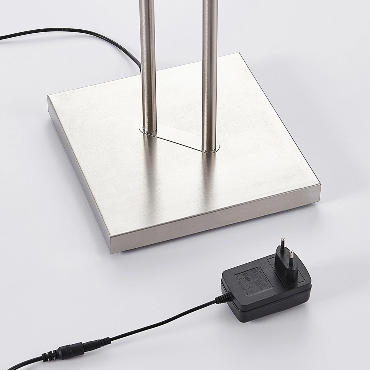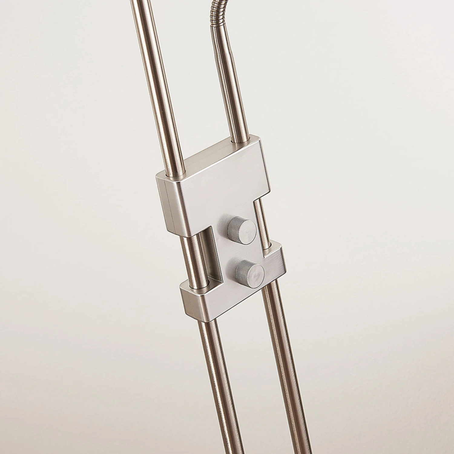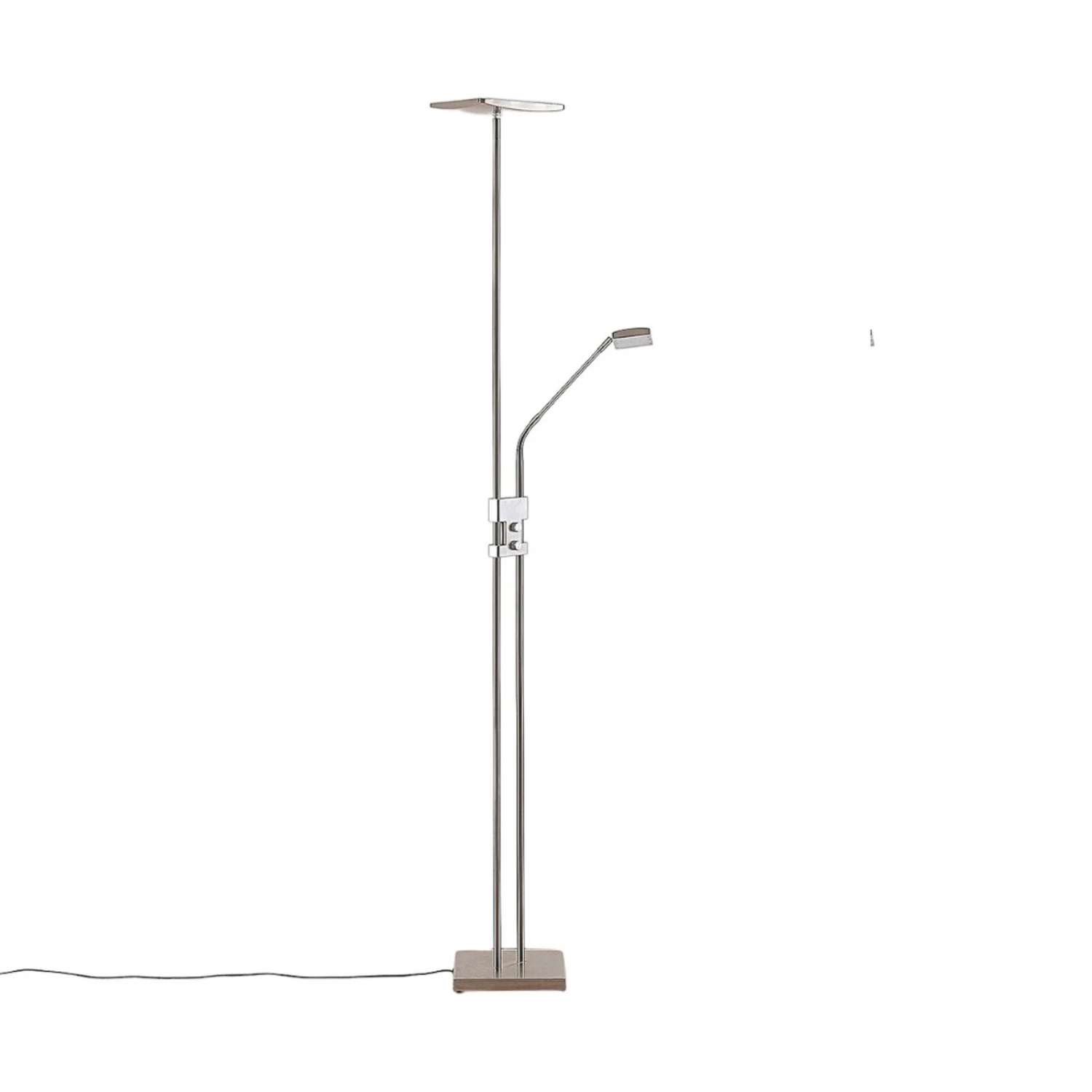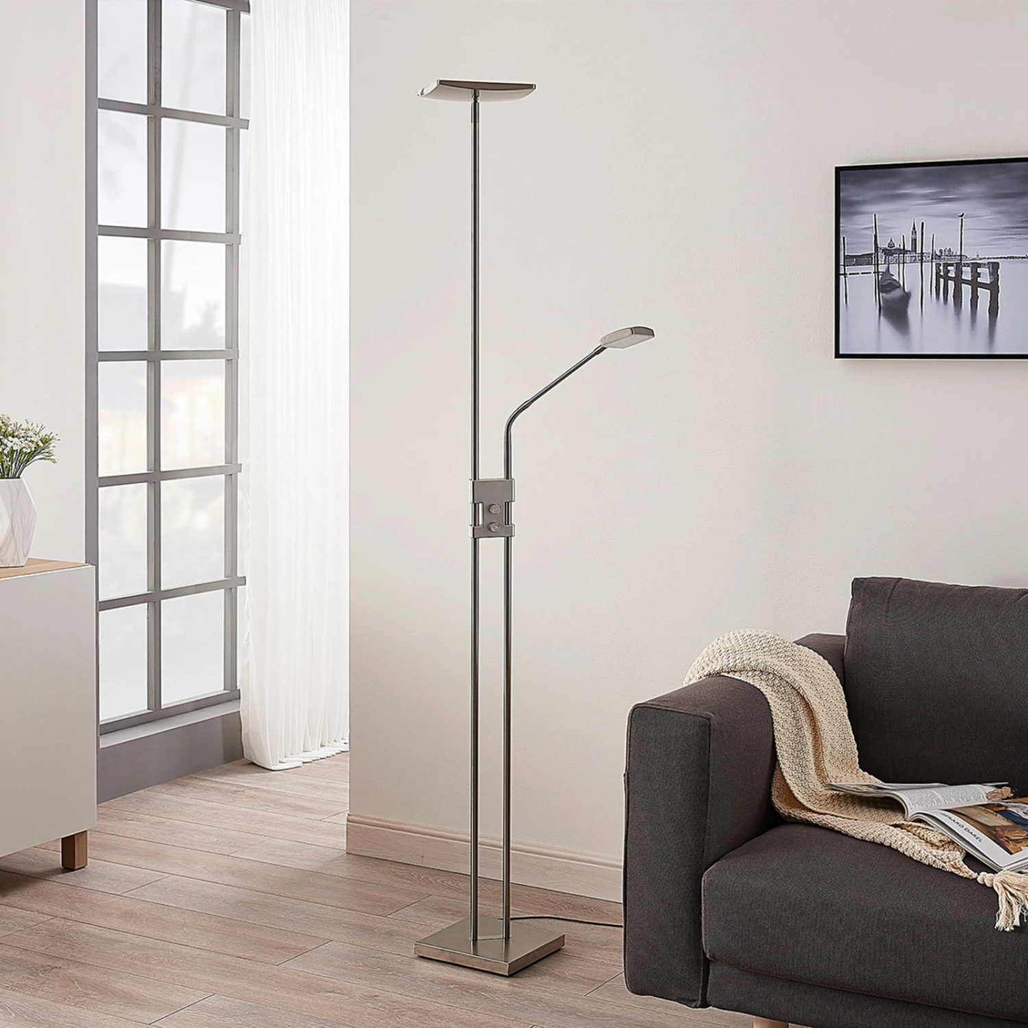 Lampadaire LED pratique Jonne avec lampe de lecture intégréeJonne est un lampadaire LED d’apparence assez moderne, fabriqué en métal nickelé satiné. Le plafonnier produit une lumière indirecte dirigée vers le haut, qui convient merveilleusement à un éclairage confortable le soir et à la détente. En outre, un bras de lecture a été intégré, qui peut être réglé selon les besoins, afin d’obtenir une orientation optimale de la lumière et une lumière ciblée pour la lecture. La forme de base des deux sources lumineuses est carrée, ce qui semble très moderne. La liseuse peut être allumée et éteinte et les LED du plafonnier peuvent être atténuées. Les deux interrupteurs se trouvent à mi-hauteur de la structure et sont faciles à utiliser.