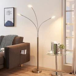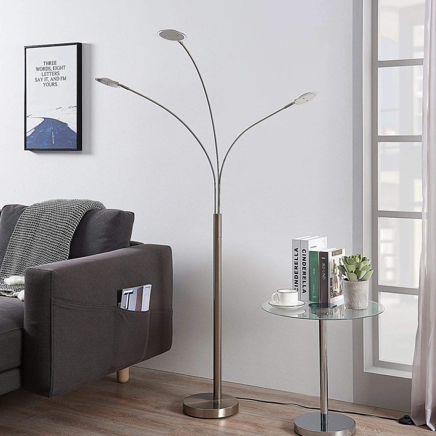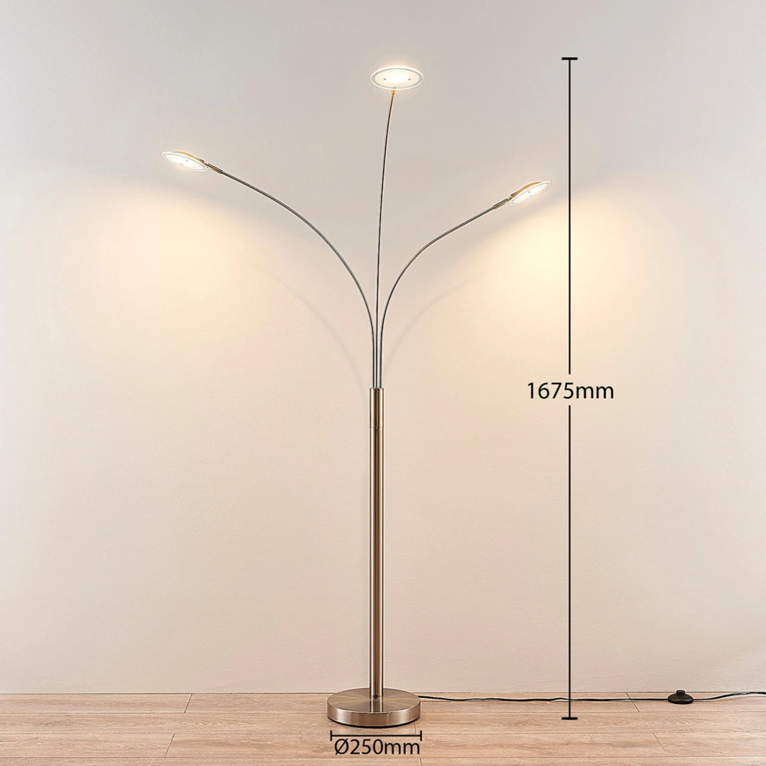Anea est équipé de trois abat-jour qui ne ressemblent toutefois en rien à des abat-jour classiques, mais qui sont de forme plate et ronde. Les vitres sont en verre givré, ce qui adoucit la lumière dans la pièce. Un interrupteur à pied permet d’allumer et d’éteindre facilement le luminaire et les LED du lampadaire produisent une bonne luminosité malgré une faible consommation d’énergie.