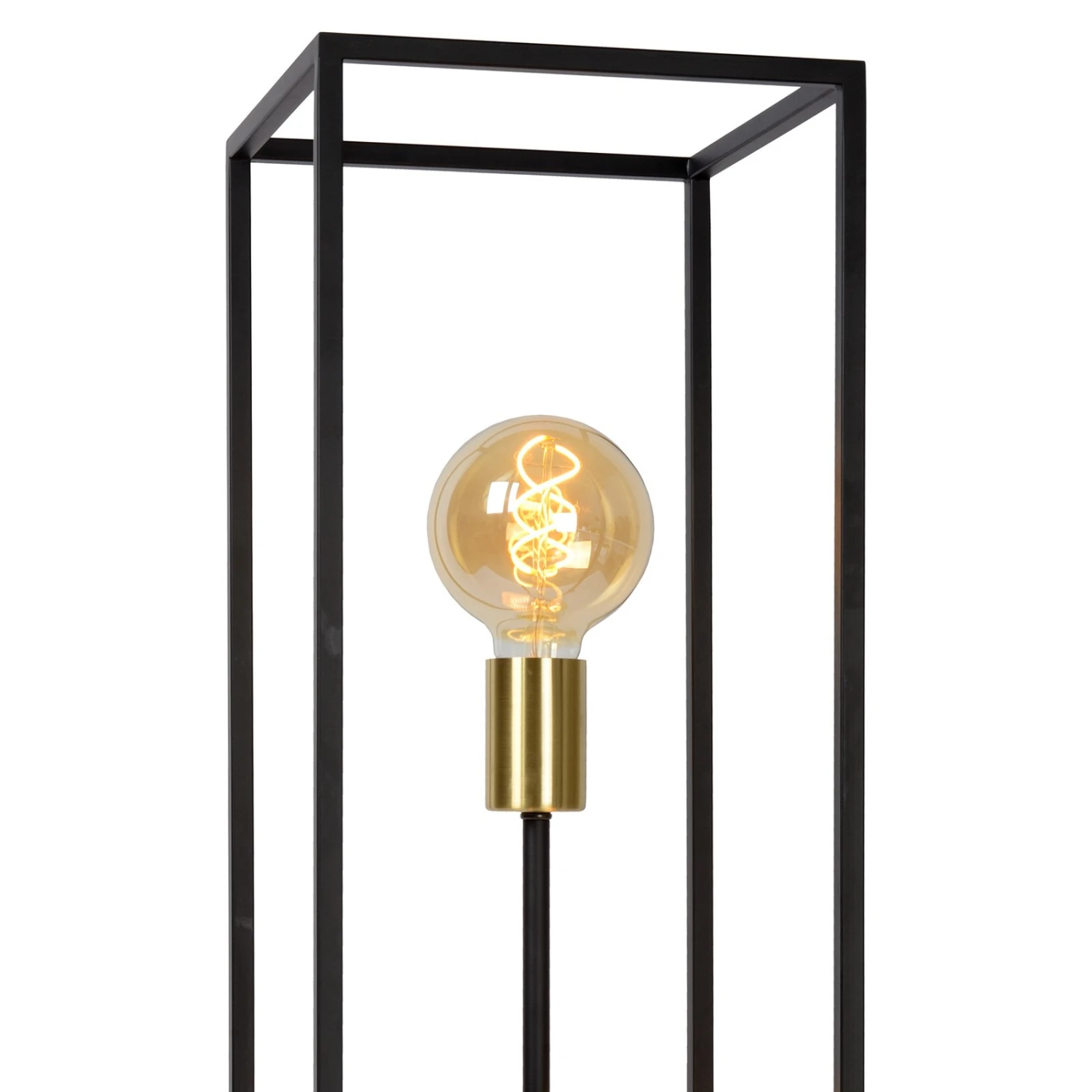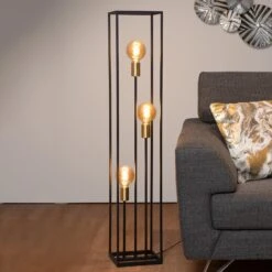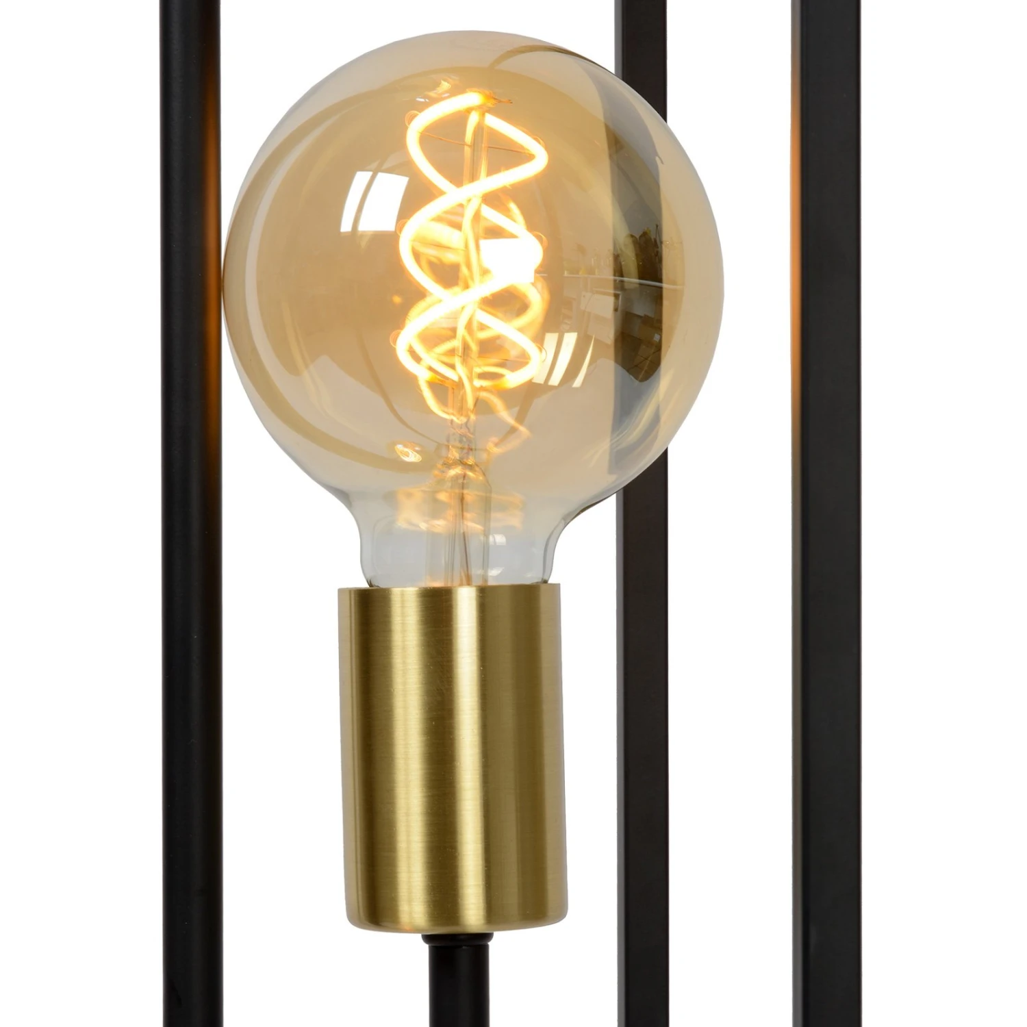 La lampe de sol est équipée de trois douilles E27, entourées par le cadre noir en métal. Elles sont montées sur trois tiges de différentes longueurs, dont l’extrémité supérieure est finie par un détail en laiton doré. Les tiges sont fixées côte à côte sur la barre centrale du support métallique.