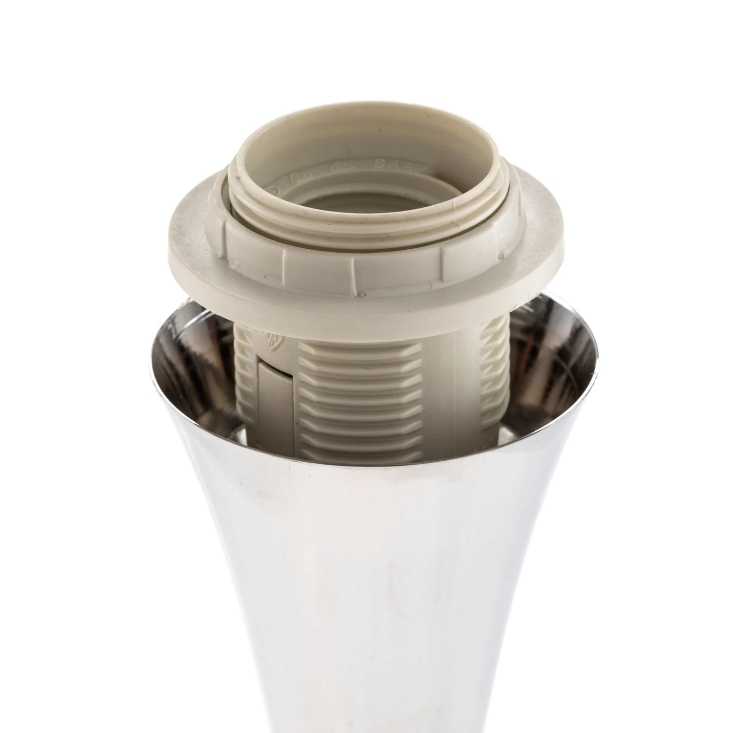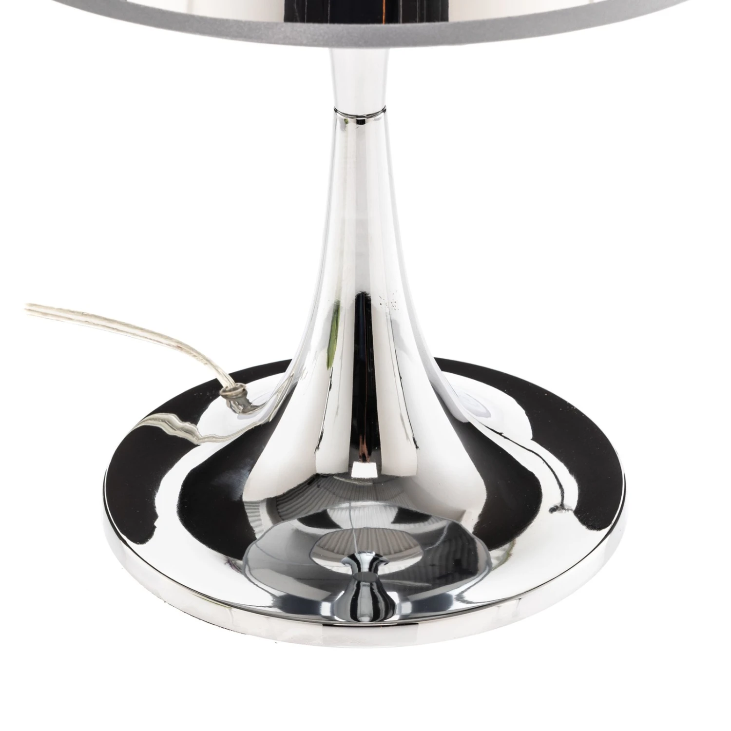 La surface chromée clairement réfléchissante de la base métallique de la lampe à poser London Cromo attire immédiatement l’attention. Celle-ci est incurvée de manière concave, de sorte qu’elle se rétrécit à partir de la base large et se renforce finalement à nouveau au point supérieur dans la douille E27.