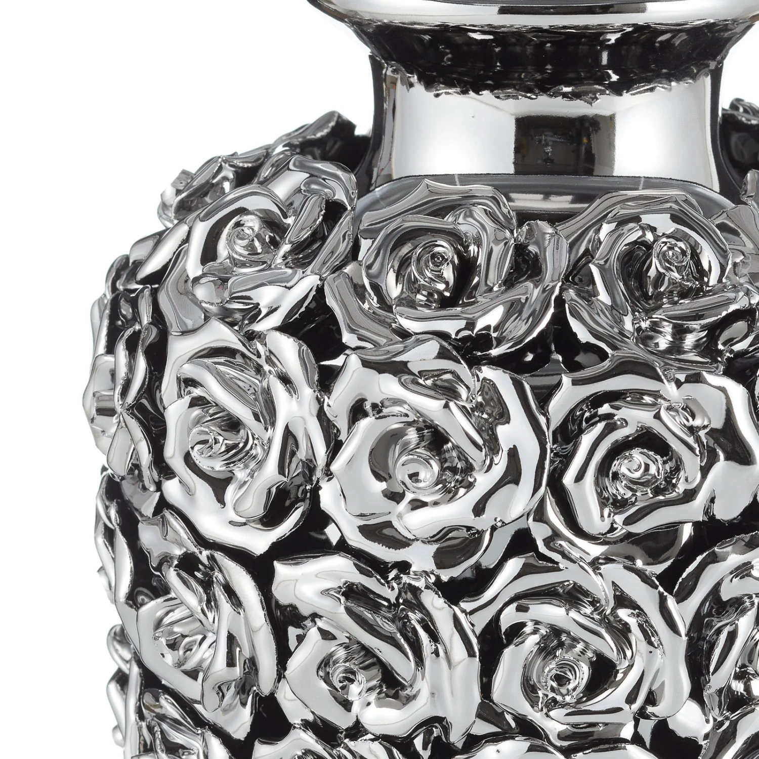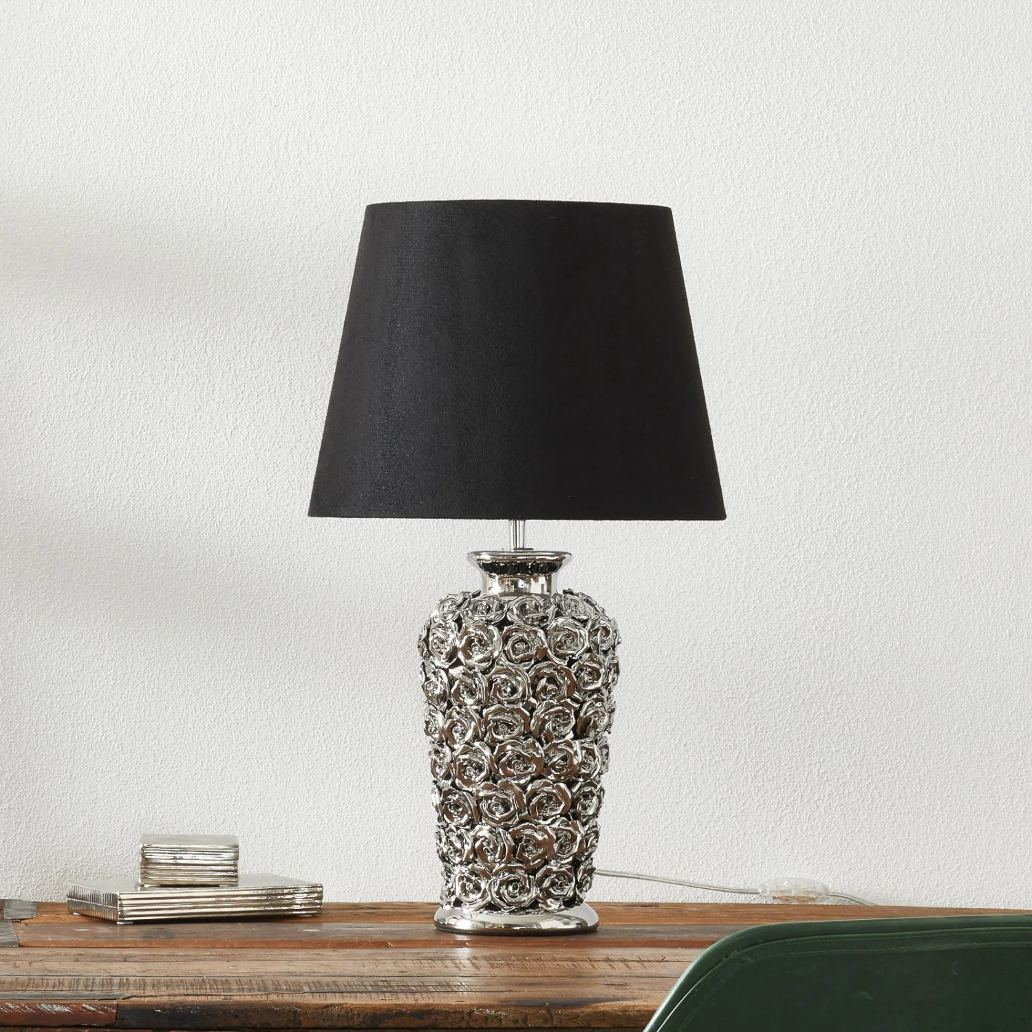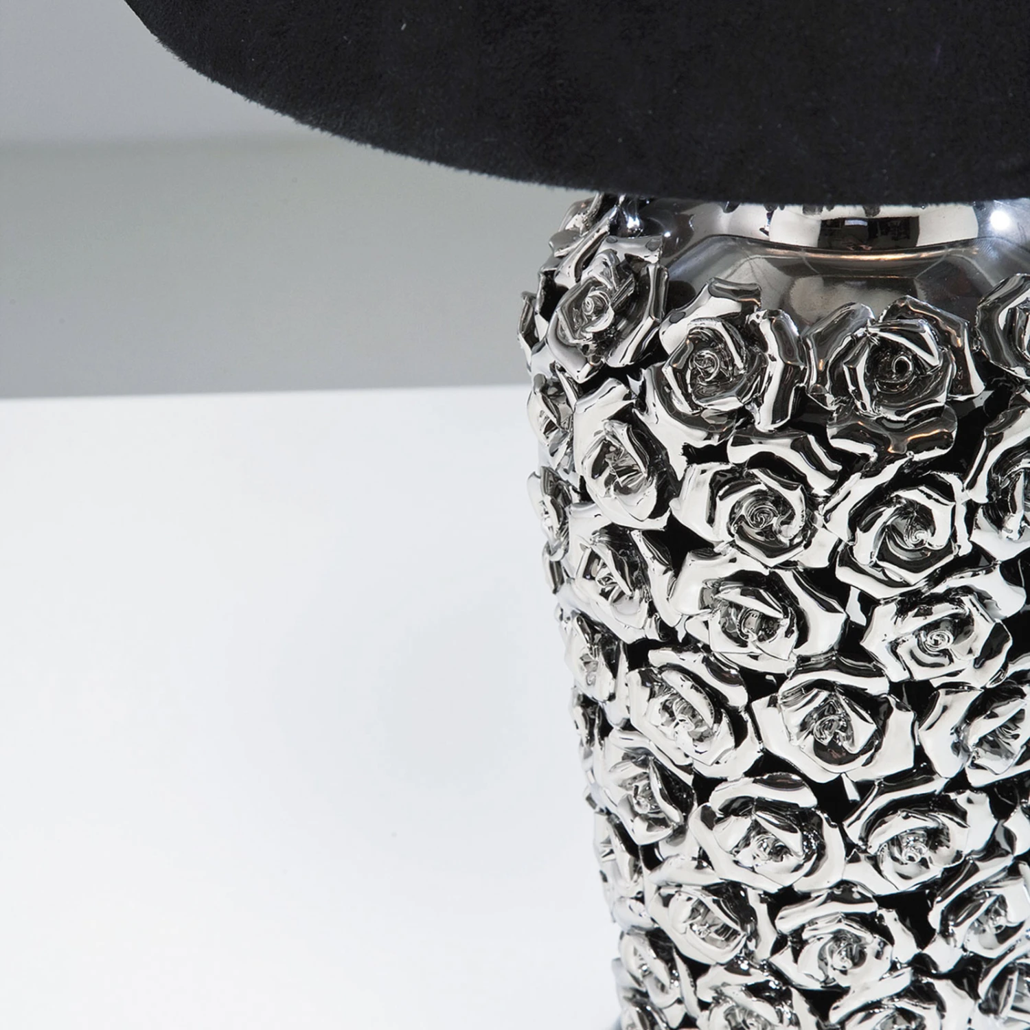 Une multitude de roses de couleur argenté brillant recouvrent le pied de la lampe à poser Rose Multi, comme un bouquet de fleurs bien dense. Par ailleurs, la lampe à poser est couronnée d’un abat-jour en velours noir doux qui crée de jolis effets lumineux. Ainsi, Rose Multi est une combinaison réussie entre un tissage mat et une brillance métallique. Les couleurs noir et argenté rayonnent une élégance qui résiste aux fluctuations des tendances.