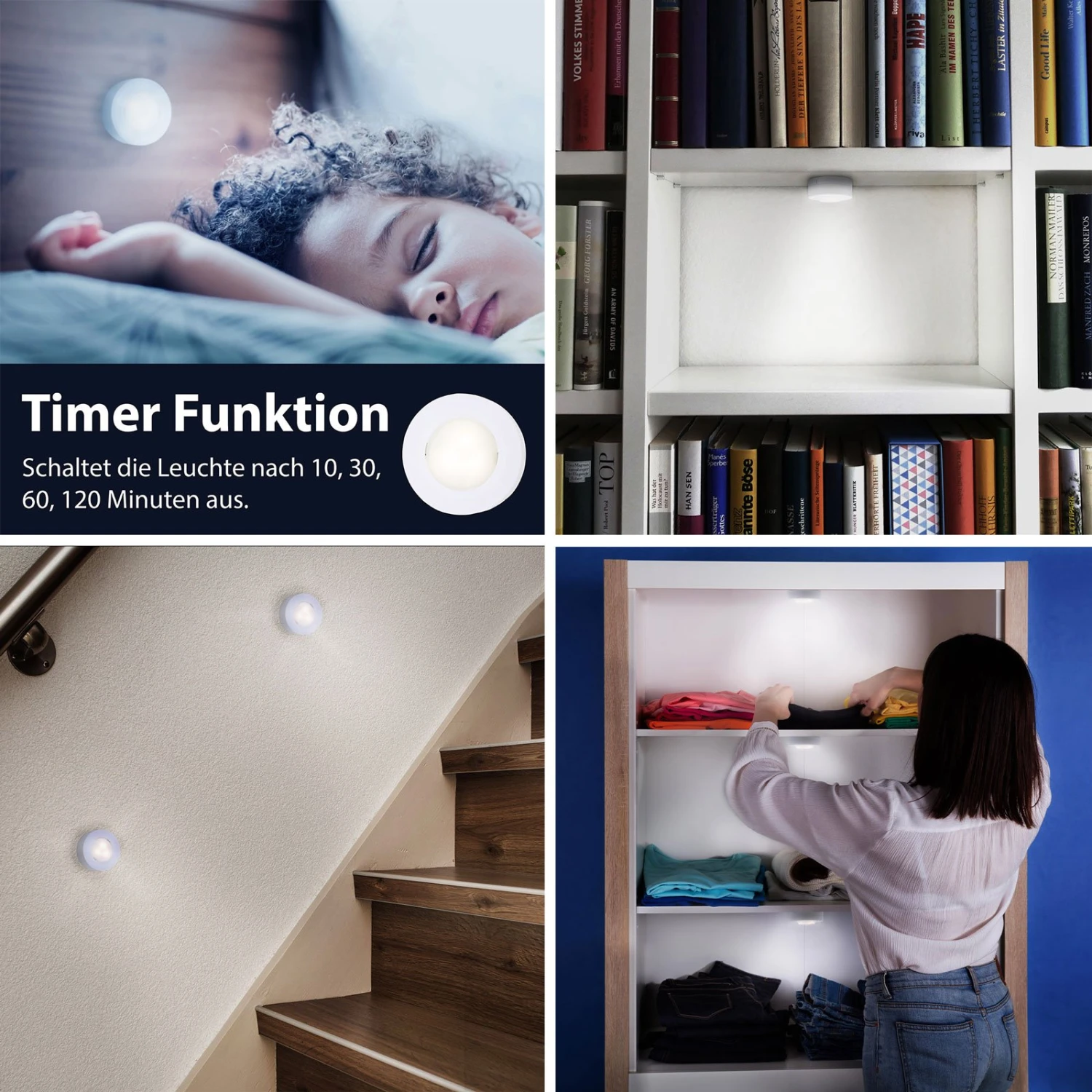 Les six lumières LED de l’armoire peuvent être installées à l’endroit désiré à l’aide de tampons adhésifs 3M. Les lumières peuvent être allumées soit par télécommande, soit à l’aide de l’interrupteur tactile. Grâce à la fonction de minuterie intelligente, les lumières peuvent être réglées individuellement selon les besoins.