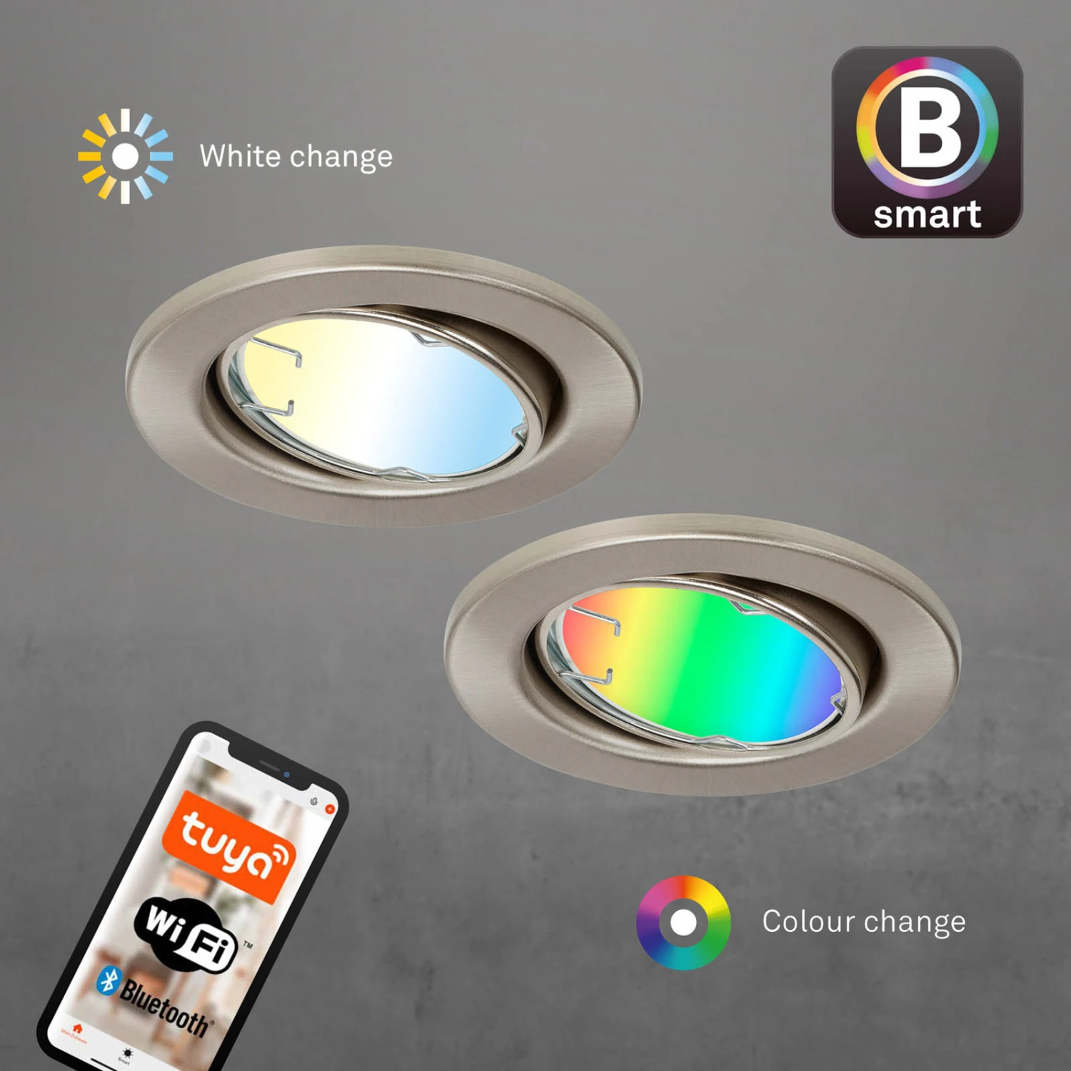 Luminaire LED encastré à intensité variable Fit Move S en set de 3 avec fonction CCT et RGBLe discret luminaire LED encastré Fit Move S est livré dans un set pratique de 3 pièces et peut être utilisé de manière flexible dans l’espace de vie. La lumière rayonne directement en direction du sol, grâce au support pivotant, il est possible d’adapter l’angle de rayonnement selon les idées de chacun. Fit Move S peut par exemple être utilisé dans le salon, le couloir, la cuisine ou la chambre à coucher.Outre son design élégant et intemporel, le luminaire LED séduit par ses fonctions pratiques. Il est possible d’adapter la température de couleur du blanc chaud au blanc lumière du jour, d’activer la fonction de changement de couleur RGB et de faire varier l’intensité du luminaire. En outre, Fit Move S dispose d’une minuterie et d’une fonction de mémoire. Le contrôle s’effectue confortablement via la télécommande fournie. Il est également possible de configurer les paramètres via l’application gratuite tuya ou par commande vocale. En utilisant l’application, il est également possible de régler des programmes de couleurs et des effets lumineux spéciaux.- télécommande incluse- commande via l’application tuya pour iOS et Android- commande vocale via Amazon Echo et Google Home- dimmable- fonction CCT (2.700 – 6.500 K)- fonction de changement de couleur RGB- minuterie et fonction mémoire intégrées