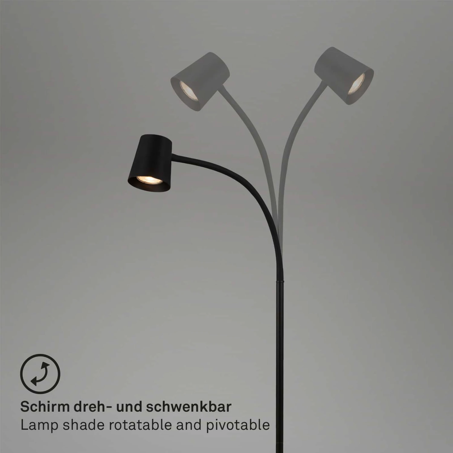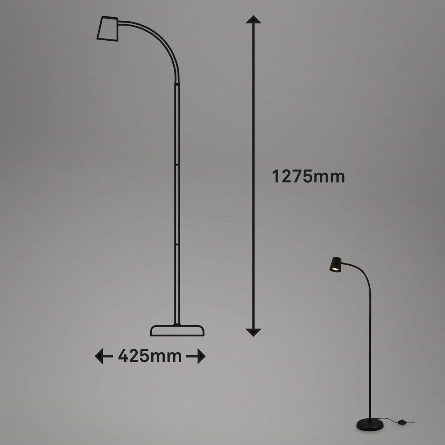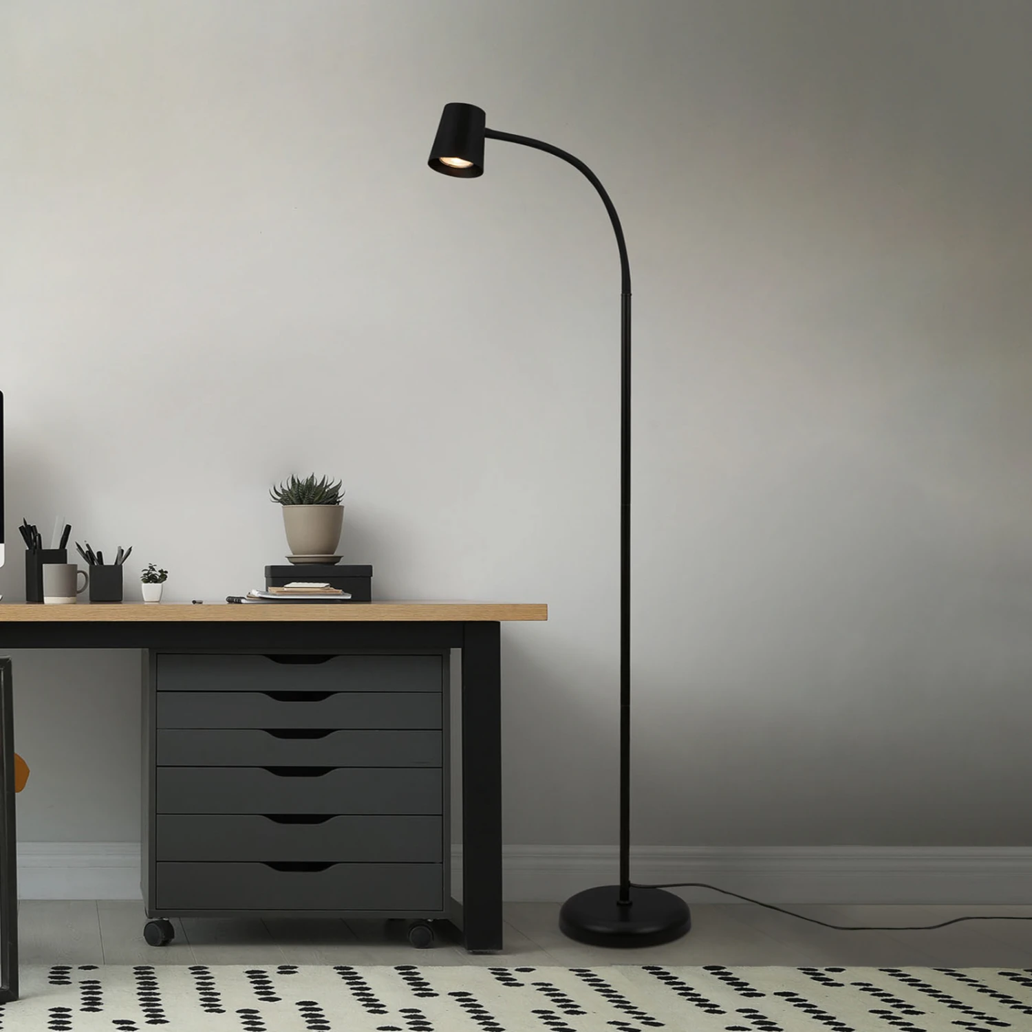 Lampadaire Skriva monochrome avec bras flexibleAu bureau ou plus généralement comme lampe de lecture, le lampadaire Skriva en métal convainc par sa lumière orientable. Cela est possible grâce au bras flexible dans la partie supérieure, qui supporte la tête en forme de cône tronqué. Équipé d’un interrupteur à pied sur le câble de la fiche.