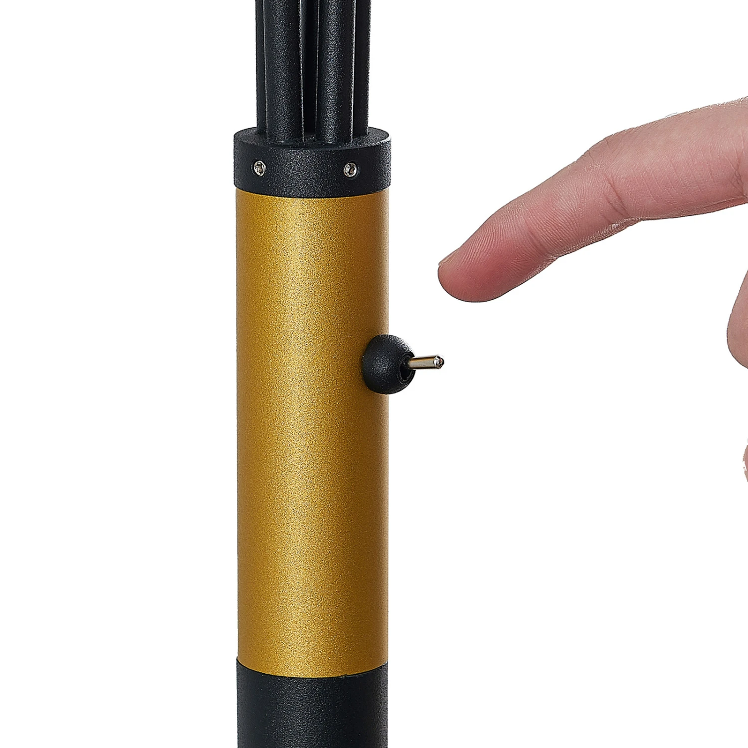 Du pied partent cinq bras de lampe, qui se courbent légèrement vers l’avant et se terminent par des abat-jour hémisphériques. La lumière est émise directement vers le bas sans éblouir.