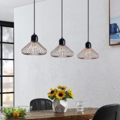 Metehan séduit par son aspect particulier et ses couleurs harmonieuses. Elle se compose d’un support de plafond allongé et de trois abat-jour, chacun étant fixé à une suspension sur celui-ci. Les abat-jour sont d’un cuivre attrayant, le support est d’un noir harmonieux. Metehan est entièrement fabriqué en fer et possède de ce fait un caractère élégant qui, associé à sa couleur, s’intègre bien dans l’ameublement d’un appartement. Ce luminaire trouve parfaitement sa place dans un salon ou une chambre à coucher et est un compagnon fiable lorsqu’il s’agit d’éclairer l’intérieur.