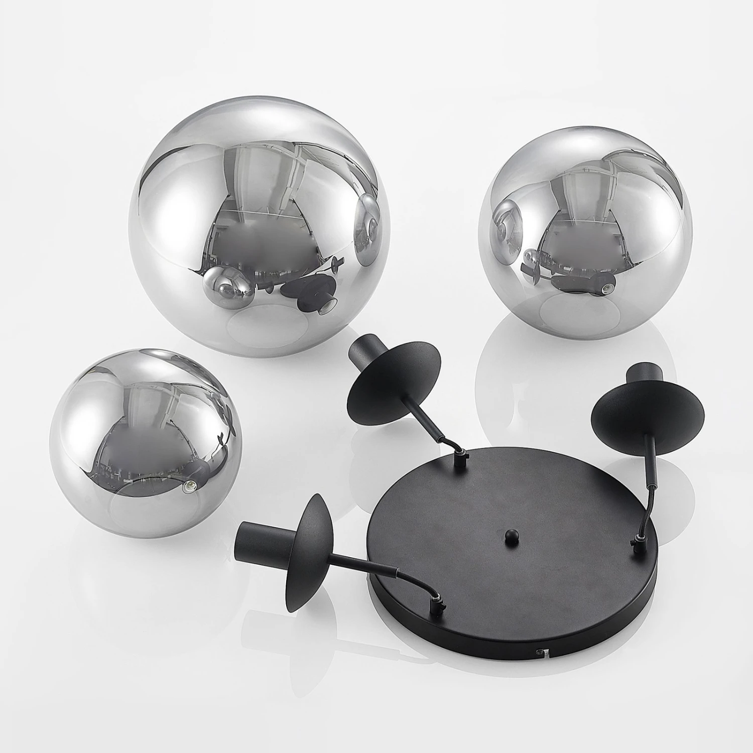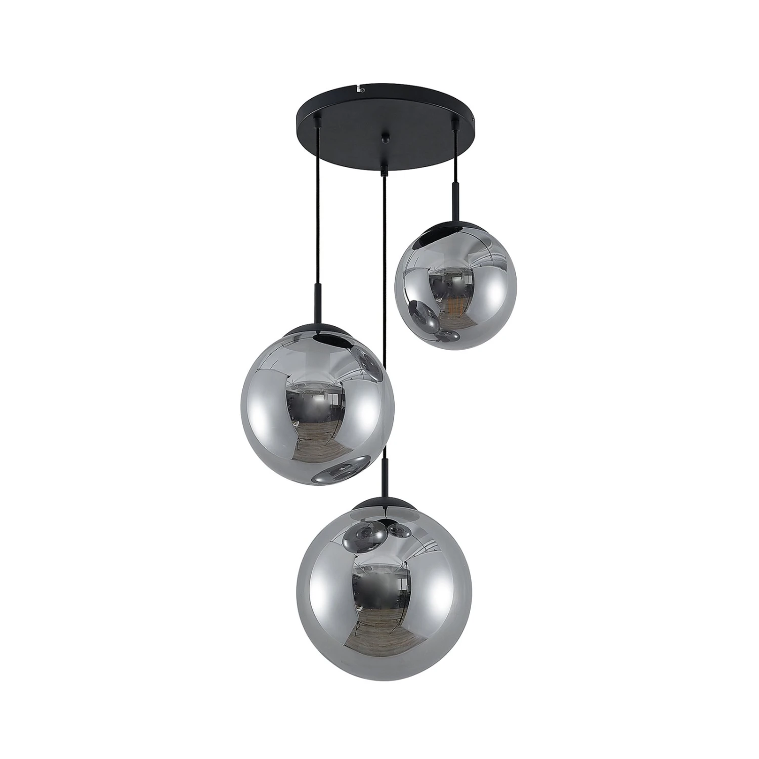 Suspension à trois lampes Teeja avec boules en verre gris fumé