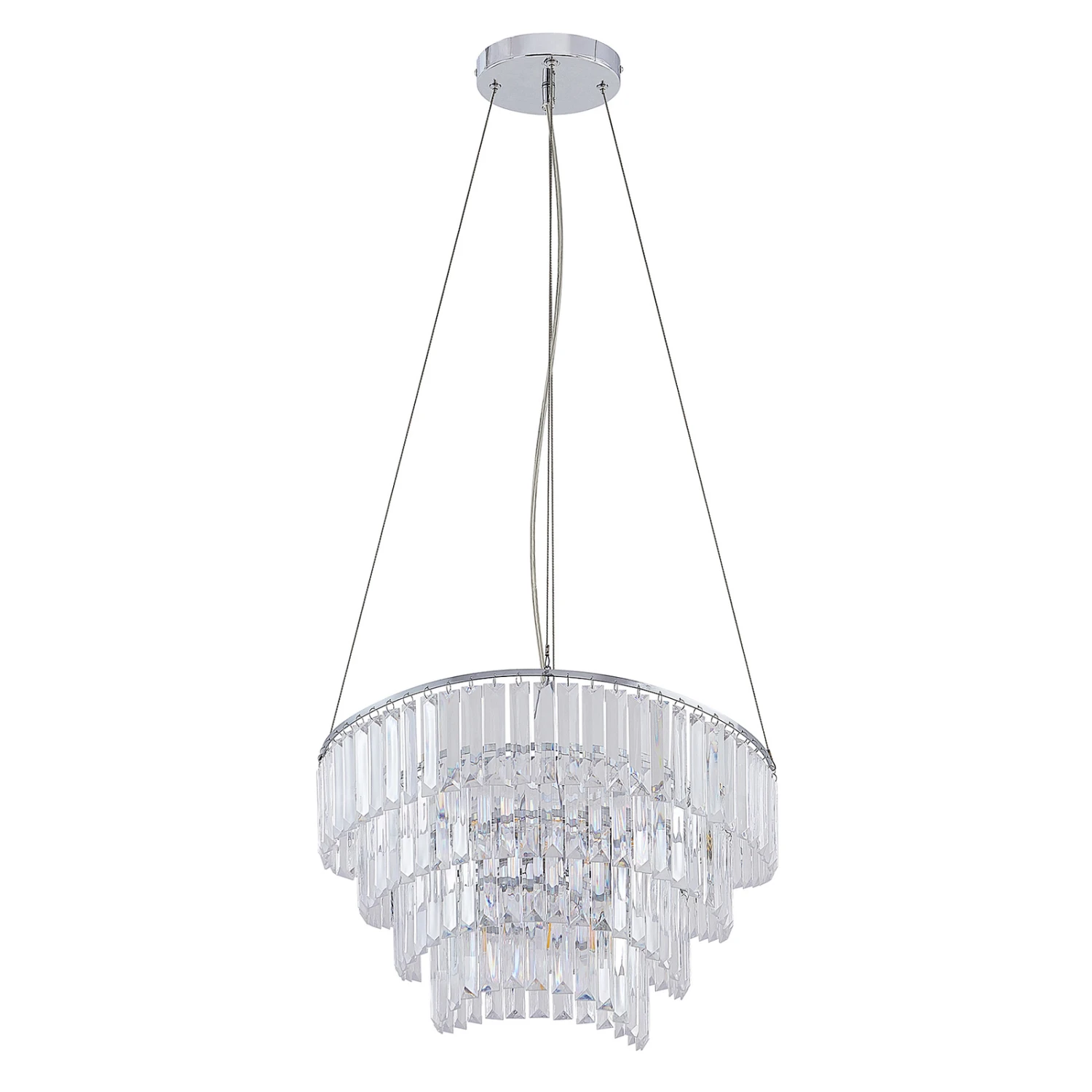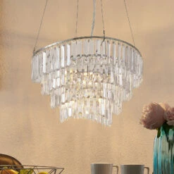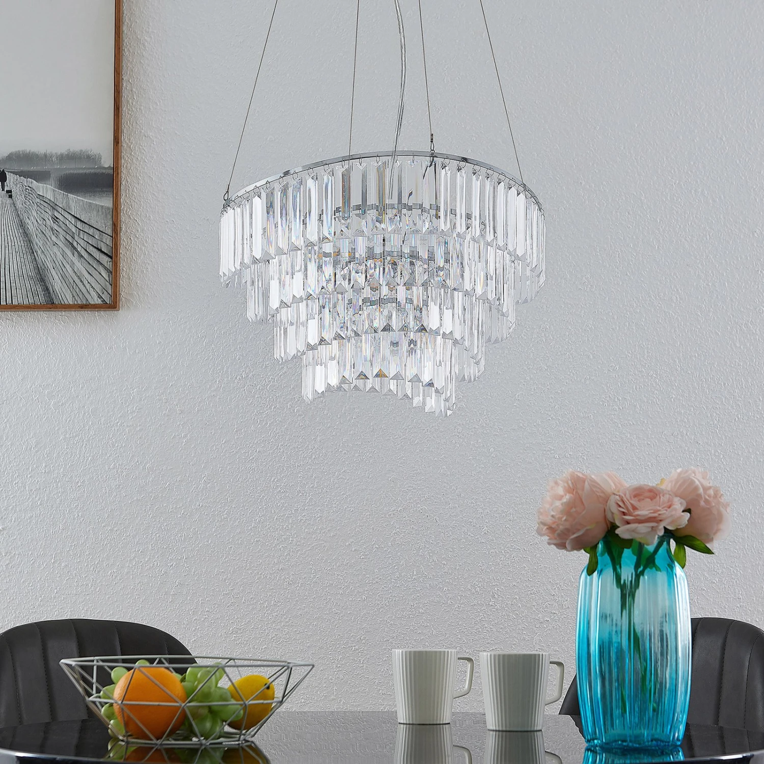 La lampe à suspension Volina brille dans un chrome moderne et crée de beaux accents lumineux dans la pièce. Au premier plan se trouve l’abat-jour en saillie, qui se détache de son environnement comme un lustre élégant. Il se compose de nombreux petits éléments transparents, qui sont attachés en quatre couches les uns au-dessus des autres et permettent d’obtenir un beau scintillement.