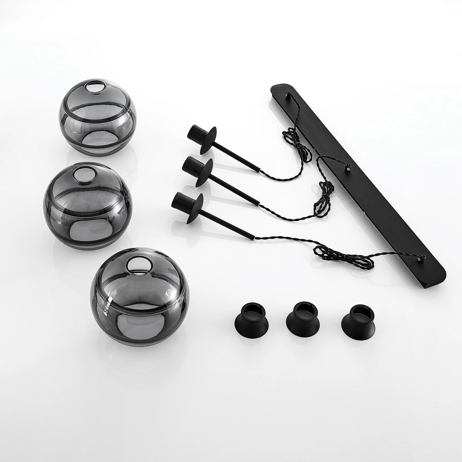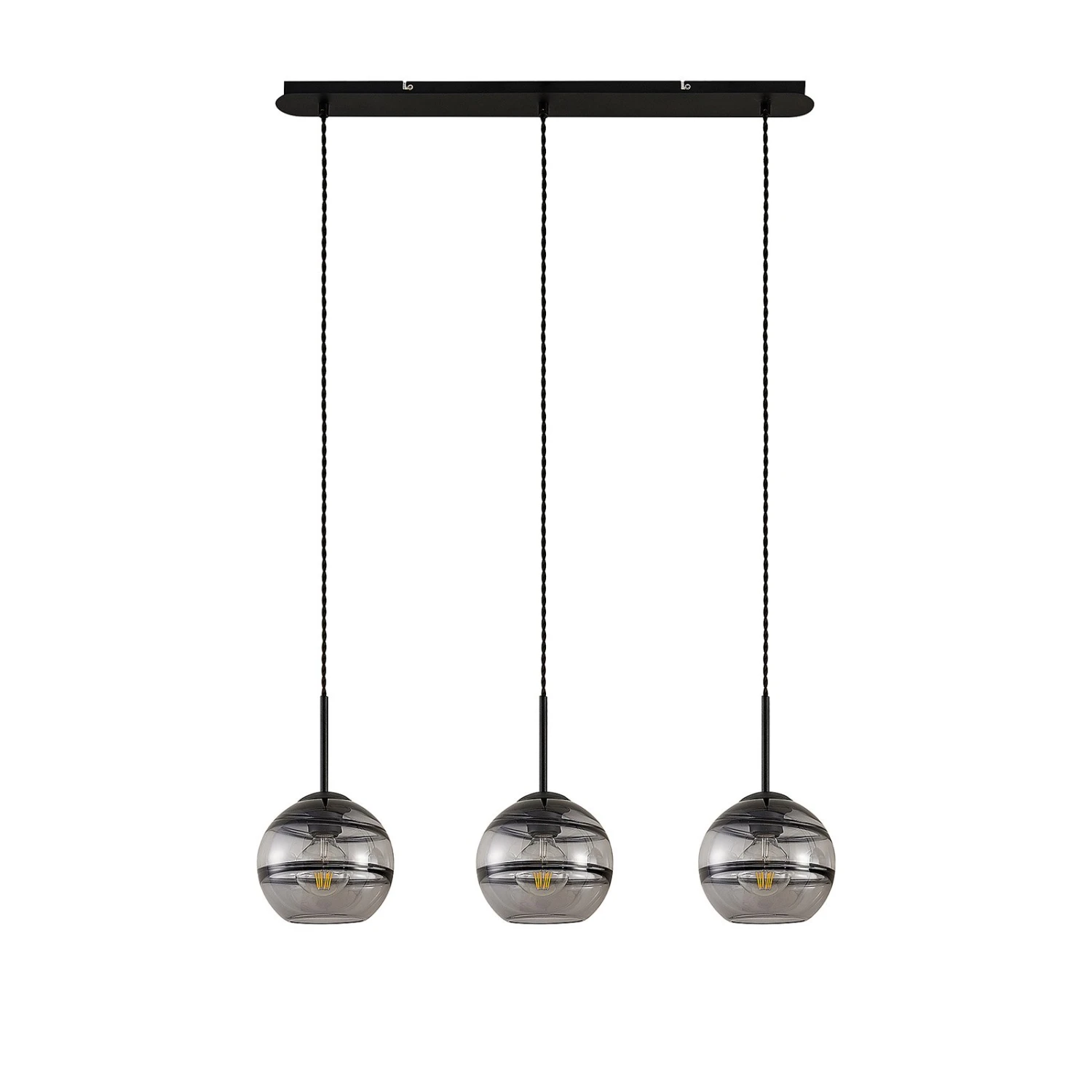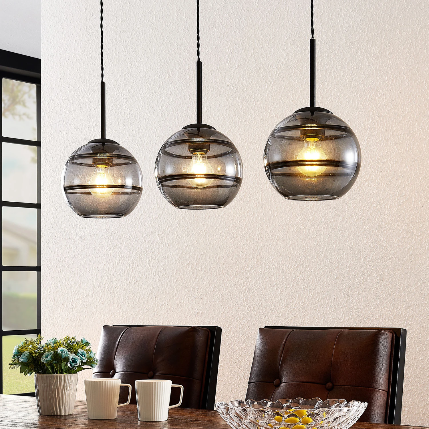 Pendentif Ably à trois lampes avec des nuances sphériques de verre fumé – parfait comme éclairage élégant de la salle à manger