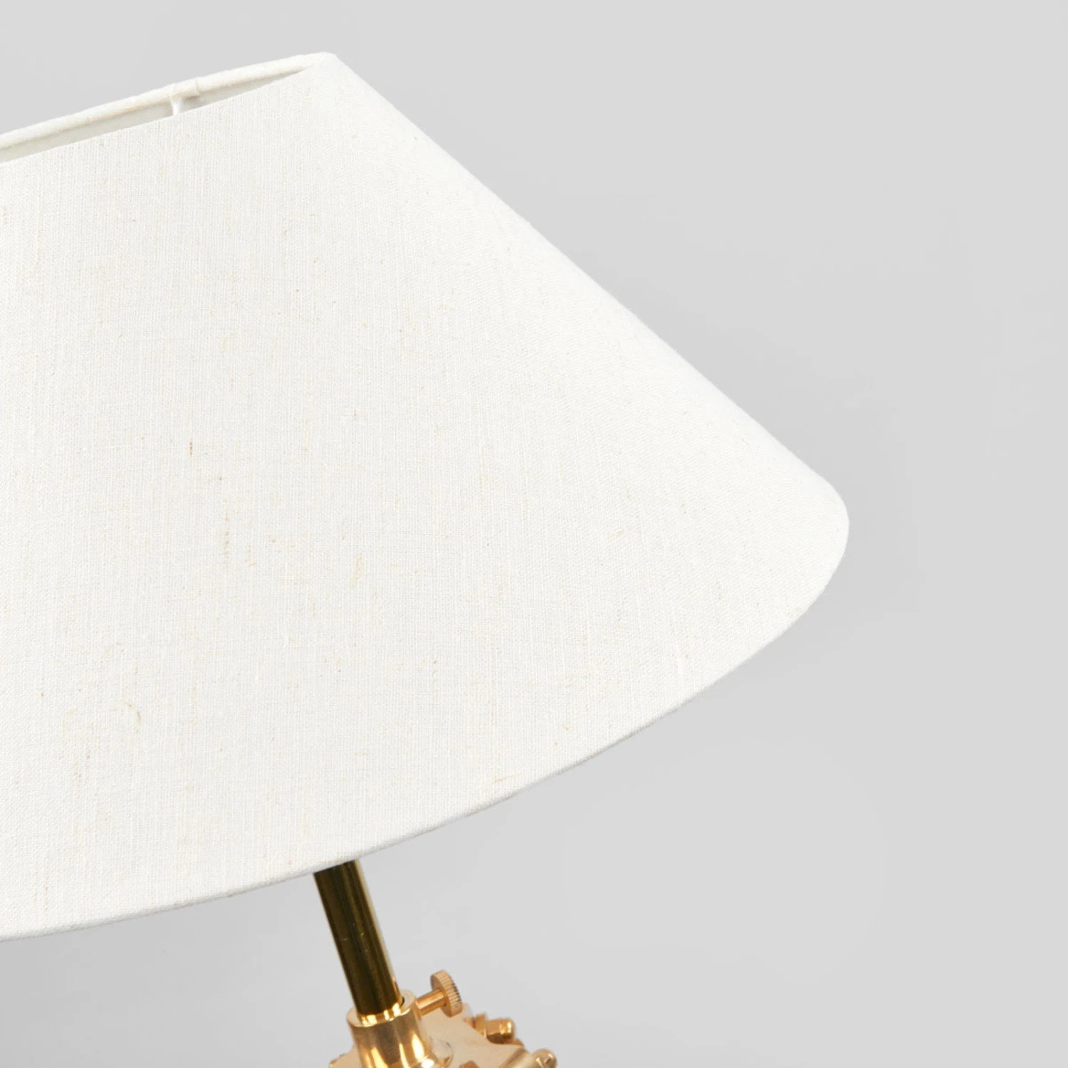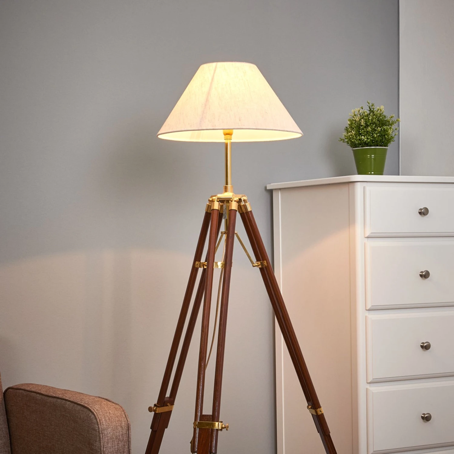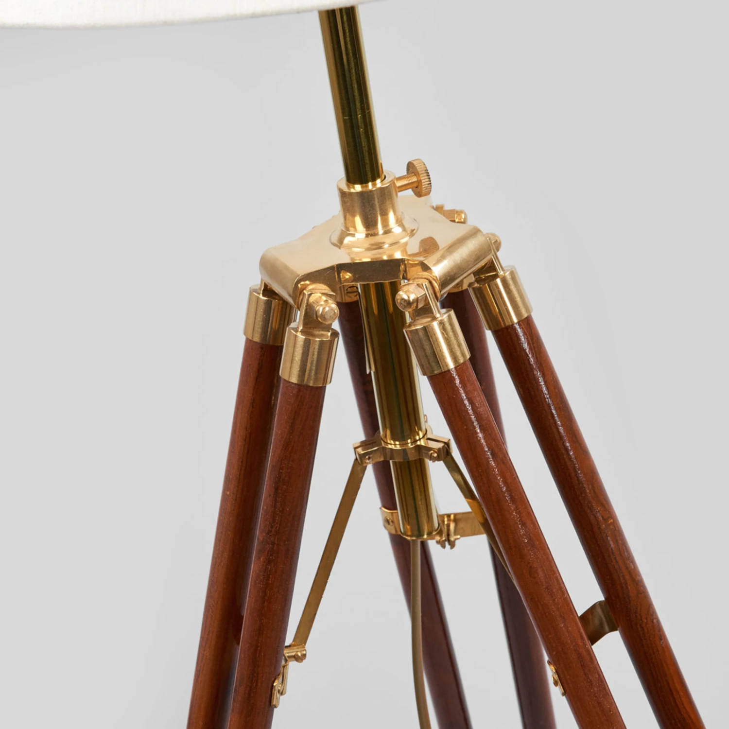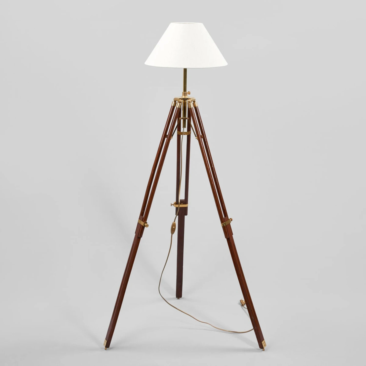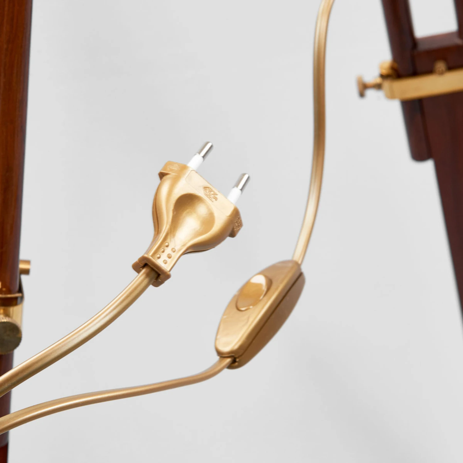 Lampadaire réglable STATIV avec bois et laitonLe lampadaire à trois pieds Stativ est particulièrement élégant grâce au mélange de matériaux en bois foncé et en laiton. Le bois utilisé, le « Sheesham », est une essence de bois de plantation indienne. Aucun bois tropical n’a été utilisé. Le pied peut être réglé en hauteur de 123 à 146 cm et ainsi être adapté aux circonstances. L’abat-jour blanc diffuse une lumière agréable et confortable et contribue ainsi largement à créer une atmosphère chaleureuse. Ce lampadaire exceptionnel ne manquera pas d’attirer les regards.