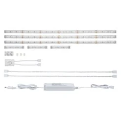 Le MaxLED 500 Comfort Set Kitchen est conçu comme une lampe de travail sur les armoires de cuisine. Les trois bandes LED fournies ont une longueur de 60 cm, peuvent être raccourcies si nécessaire (tous les 8 cm) et sont utilisées pour éclairer trois armoires. Deux câbles supplémentaires sont également inclus, qui permettent de relier les bandes entre elles si une hotte aspirante ou similaire est montée entre les armoires murales. L’ensemble peut être facilement connecté à l’alimentation électrique via le long câble d’alimentation. De plus, un interrupteur est inclus qui permet d’allumer et d’éteindre directement l’armoire. L’interrupteur est équipé d’un variateur à effleurement : en le touchant brièvement, il réagit avec « on » ou « off », en le maintenant enfoncé plus longtemps, il réagit avec une gradation progressive. Grâce à l’installation facile à l’aide d’un matériau autocollant et d’un système d’enfichage simple, une lampe de travail adaptée est créée en un rien de temps dans la cuisine, ce qui est non seulement fonctionnel mais crée également une ambiance attrayante.