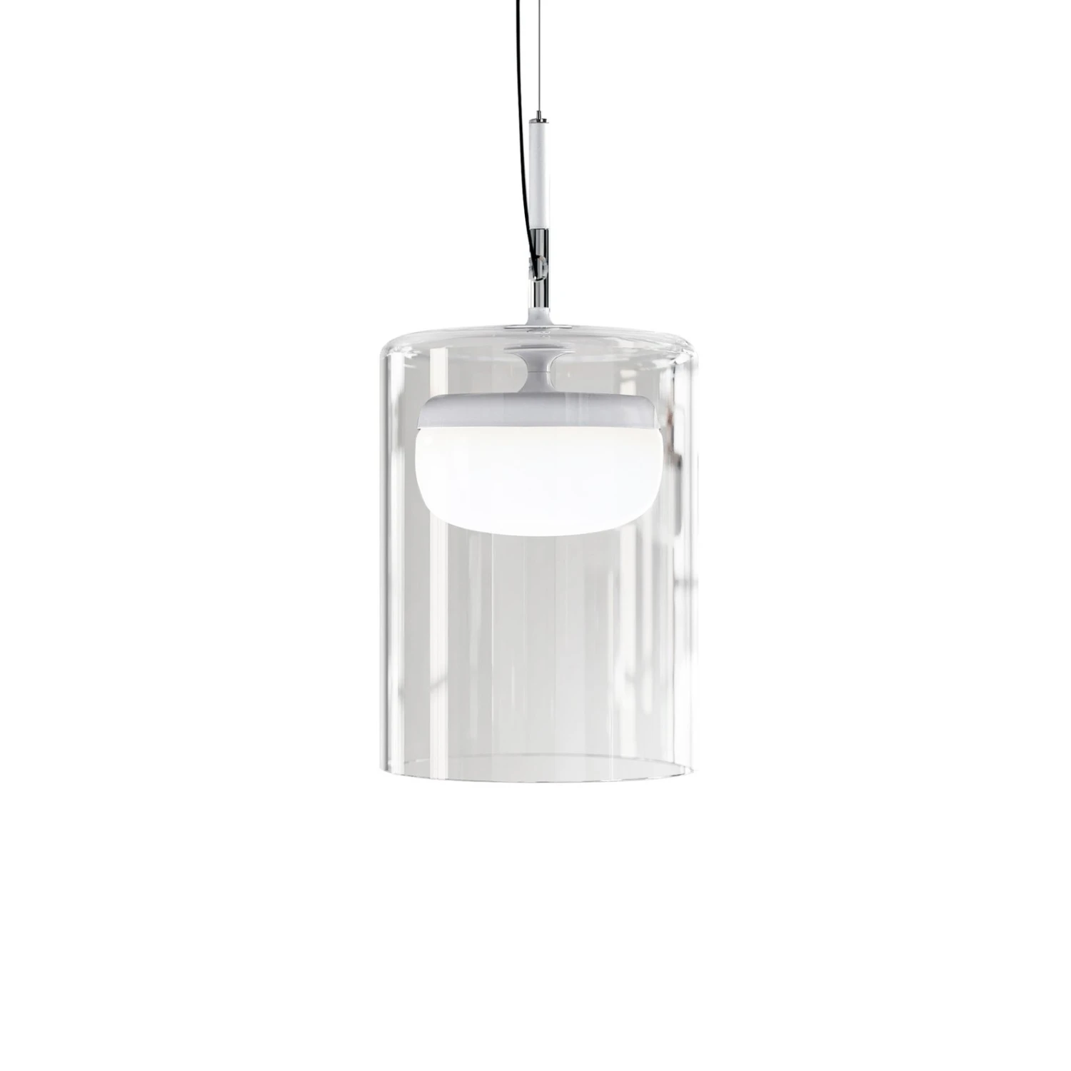 L’abat-jour cylindrique est fait de verre clair soufflé à la bouche, à l’intérieur duquel se trouve un diffuseur blanc opale presque hémisphérique, également soufflé à la bouche et maintenu par un élément métallique laqué dans l’abat-jour clair. Cette combinaison de différentes nuances et surfaces fait de la lampe suspendue Diver une source de lumière qui fascine à la fois visuellement et en termes de technologie d’éclairage.
