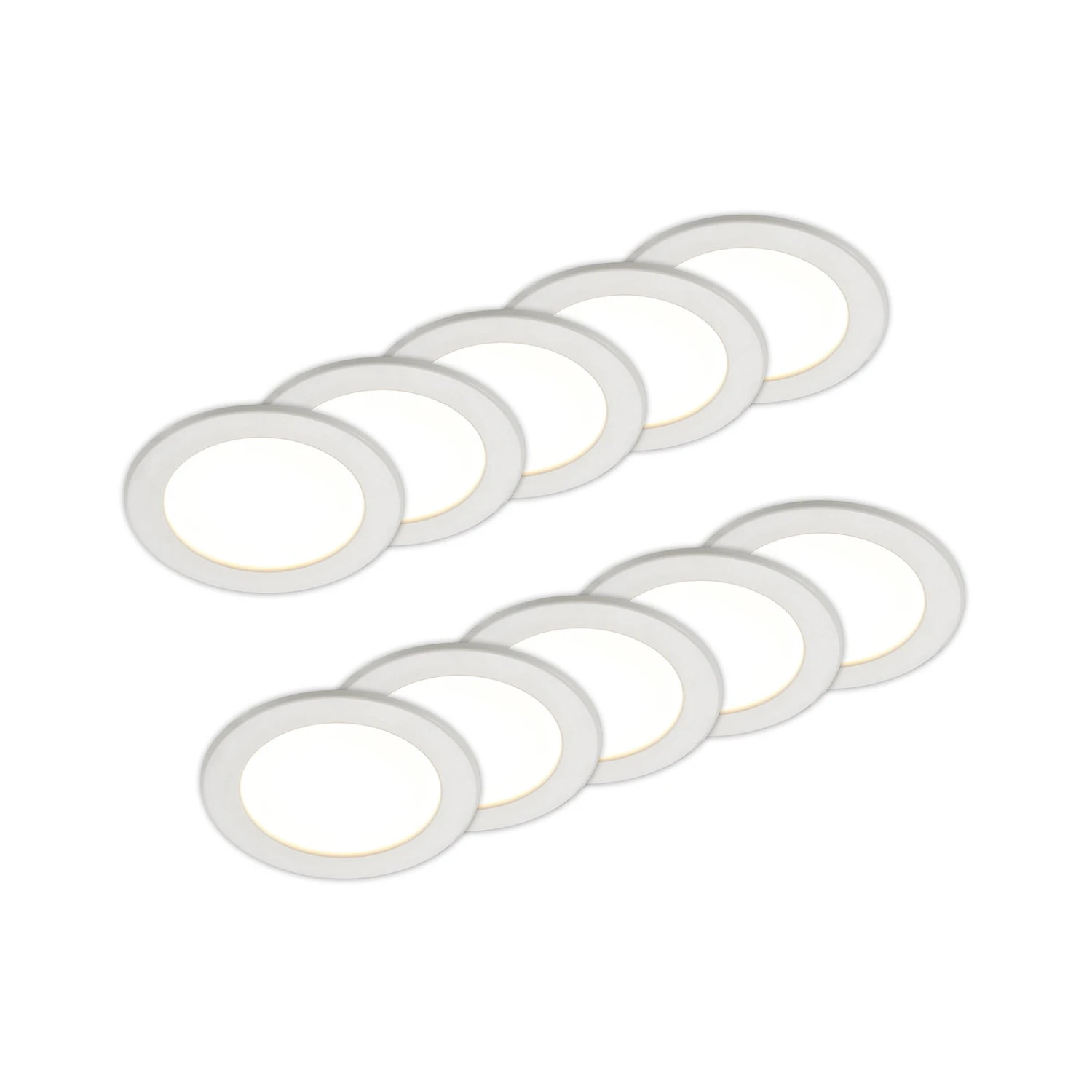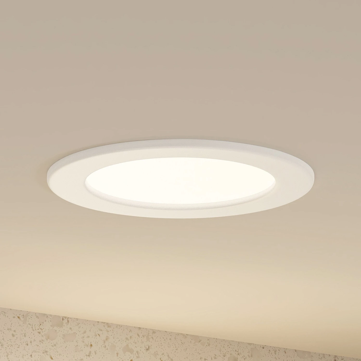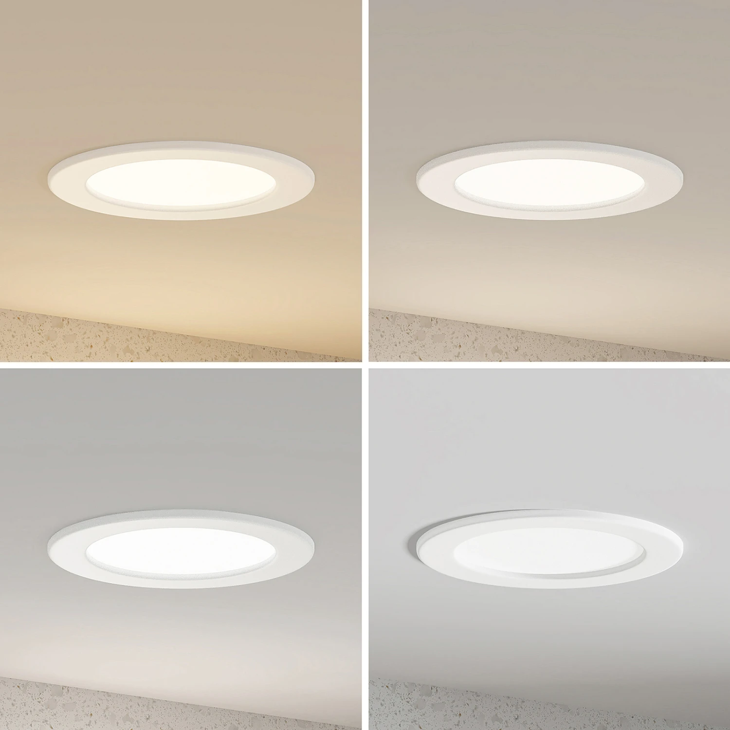 Luminaire LED encastré rond et dimmable Cadance en blanc, couleur de lumière préréglable, IP44 – dans un set pratique de 10La lampe LED encastrée Cadance est ici d’une richesse fonctionnelle particulière, car elle peut faire plus qu’éclairer, son apparence est au contraire extraordinairement discrète avec sa forme ronde et sa surface blanche. Ainsi, la lampe encastrée peut être utilisée de manière polyvalente, que ce soit dans des pièces privées ou dans un environnement professionnel. Avec son indice de protection élevé, Cadance est bien protégé contre l’humidité et peut donc être utilisé dans les salles de bains et autres pièces humides. Un commutateur DIP situé sur le boîtier permet en outre de choisir la couleur de la lumière avant l’installation. Les LED peuvent être graduées à tout moment de manière externe, à condition qu’un variateur correspondant soit installé. Tout cela permet d’adapter l’éclairage à la situation spécifique sur place. Diamètre d’encastrement : – Variante 1 (11,5 cm) : 10-11 cm – Variante 2 (17 cm) : 15-16 cm- Variante 3 (22 cm) : 20-21 cm- Variante 4 (24 cm) : 22-23 cm