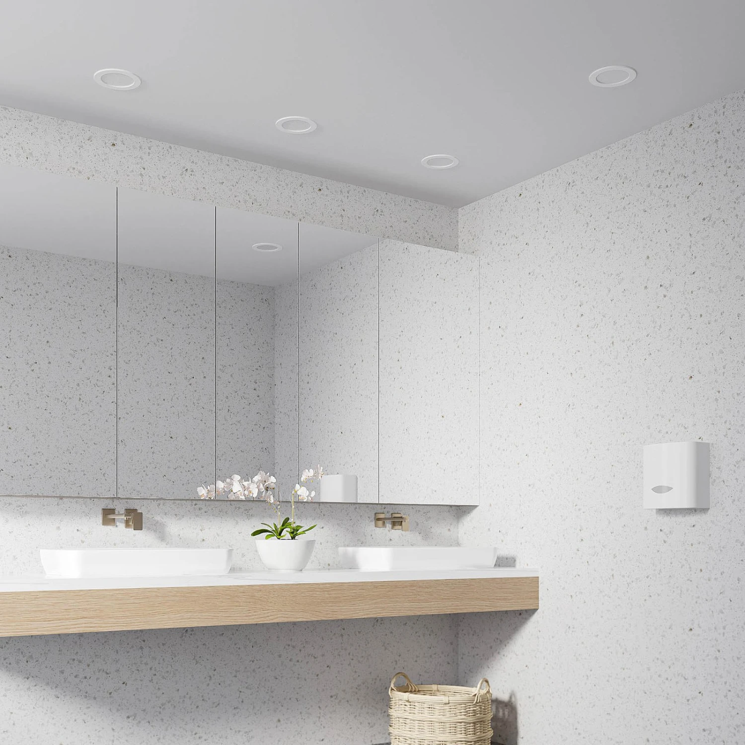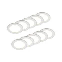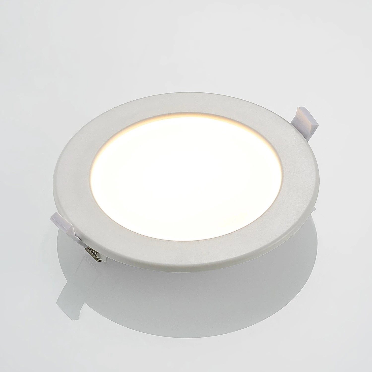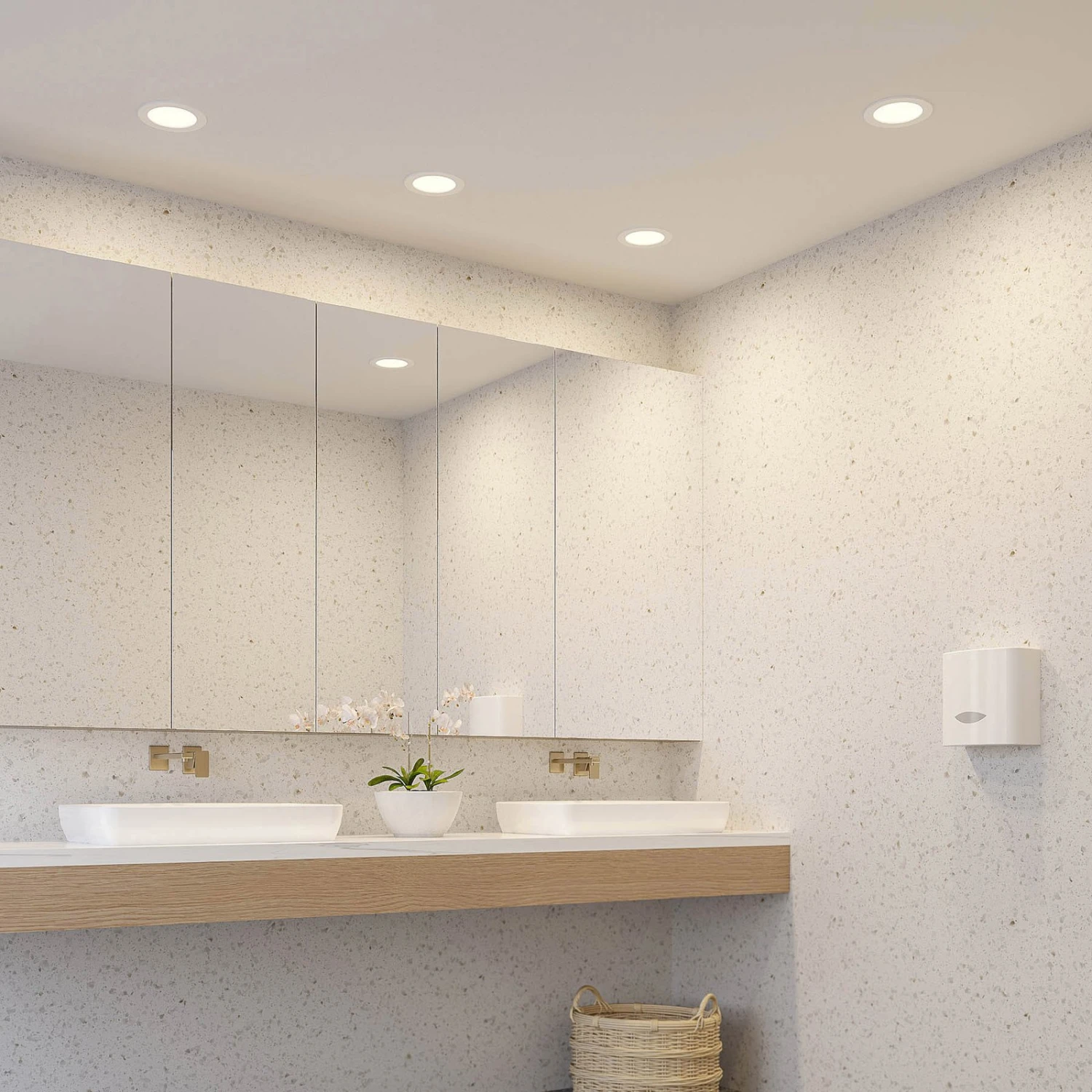 Luminaire LED encastré rond et dimmable Cadance en blanc, couleur de lumière préréglable, IP44 – dans un set pratique de 10La lampe LED encastrée Cadance est ici d’une richesse fonctionnelle particulière, car elle peut faire plus qu’éclairer, son apparence est au contraire extraordinairement discrète avec sa forme ronde et sa surface blanche. Ainsi, la lampe encastrée peut être utilisée de manière polyvalente, que ce soit dans des pièces privées ou dans un environnement professionnel. Avec son indice de protection élevé, Cadance est bien protégé contre l’humidité et peut donc être utilisé dans les salles de bains et autres pièces humides. Un commutateur DIP situé sur le boîtier permet en outre de choisir la couleur de la lumière avant l’installation. Les LED peuvent être graduées à tout moment de manière externe, à condition qu’un variateur correspondant soit installé. Tout cela permet d’adapter l’éclairage à la situation spécifique sur place. Diamètre d’encastrement : – Variante 1 (11,5 cm) : 10-11 cm – Variante 2 (17 cm) : 15-16 cm- Variante 3 (22 cm) : 20-21 cm- Variante 4 (24 cm) : 22-23 cm