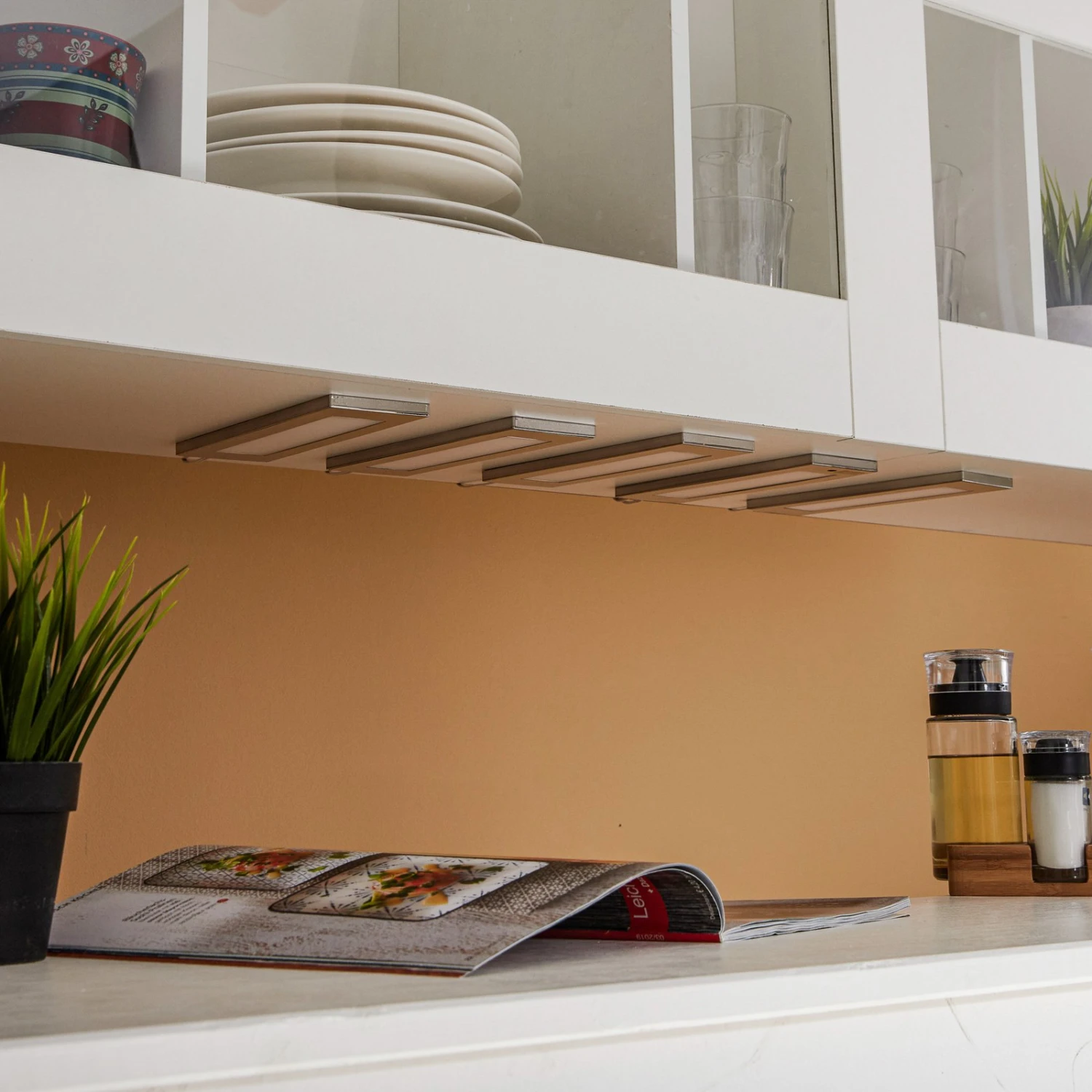 5 lampes sous plan Juska – un set pratique de lampes de cuisine à LED en acier inoxydableJuska séduit par son aspect intemporel et rectiligne ainsi que par sa belle finition en acier inoxydable. Cinq lampes sont proposées dans un même set, de sorte qu’il est toujours possible de produire suffisamment de lumière pour un éclairage clair dans la cuisine ou au-dessus d’un autre plan de travail. Les luminaires sont montés sous une armoire et l’un des cinq luminaires est appelé le luminaire principal, qui intègre non seulement l’interrupteur, mais aussi le distributeur multiple, qui sert de pièce de jonction avec les autres luminaires. Le set de luminaires se termine par une fiche européenne et peut ainsi être raccordé facilement et sans effort au réseau électrique.