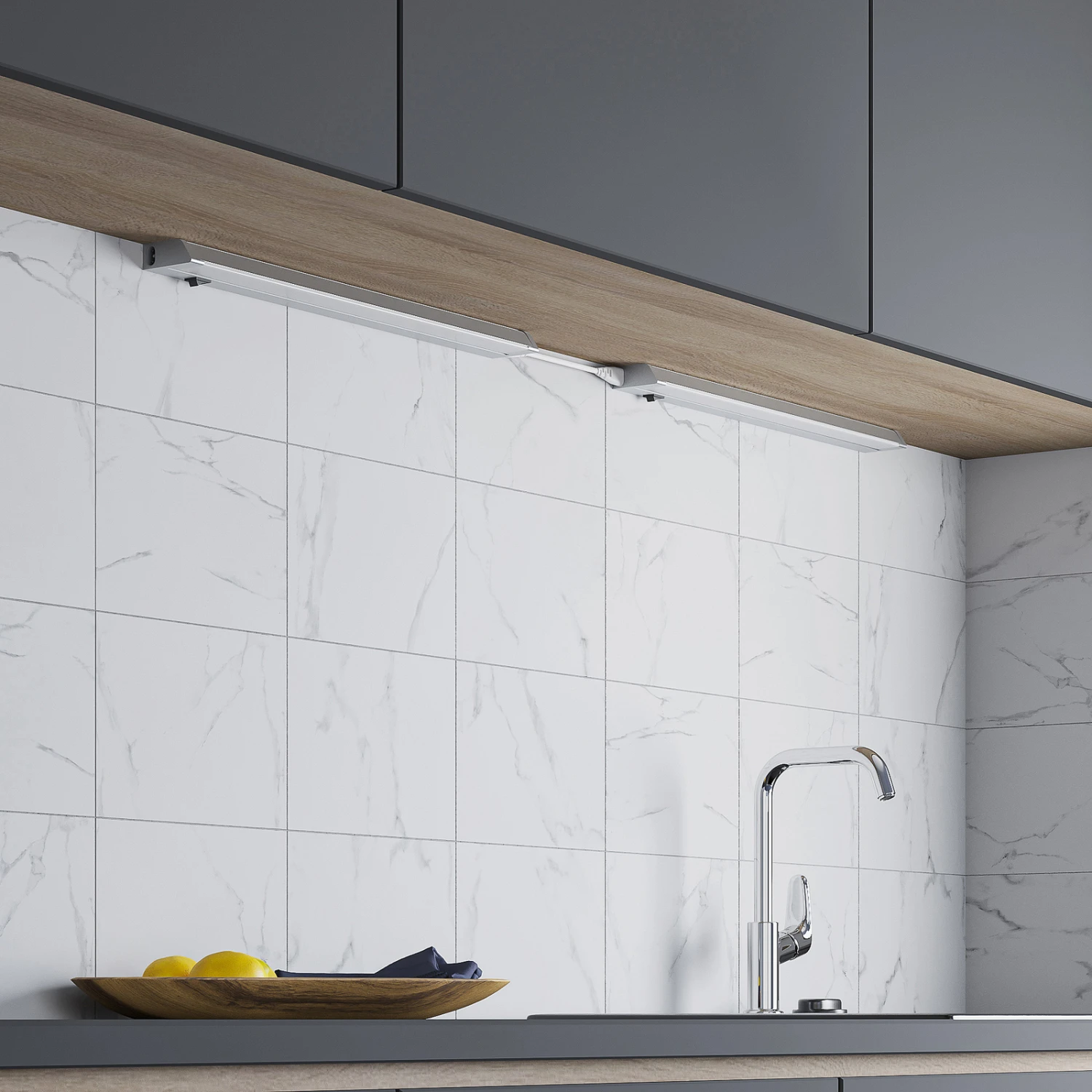 Le luminaire pour dessous d’armoire Savorik LED se présente dans un design argenté et une forme allongée. Il est principalement utilisé dans la cuisine ou dans une salle de travail ou de loisirs, car il permet d’éclairer le plan de travail de façon homogène. Grâce à l’interrupteur, vous pouvez facilement allumer et éteindre la lampe. En outre, un câble de raccordement plus long est inclus dans la livraison afin de pouvoir monter plusieurs luminaires en ligne si nécessaire. Les LED brillantes fournissent une lumière blanche universelle qui convient bien aux travaux concentrés. Ainsi, même les grandes surfaces de travail sont parfaitement éclairées.