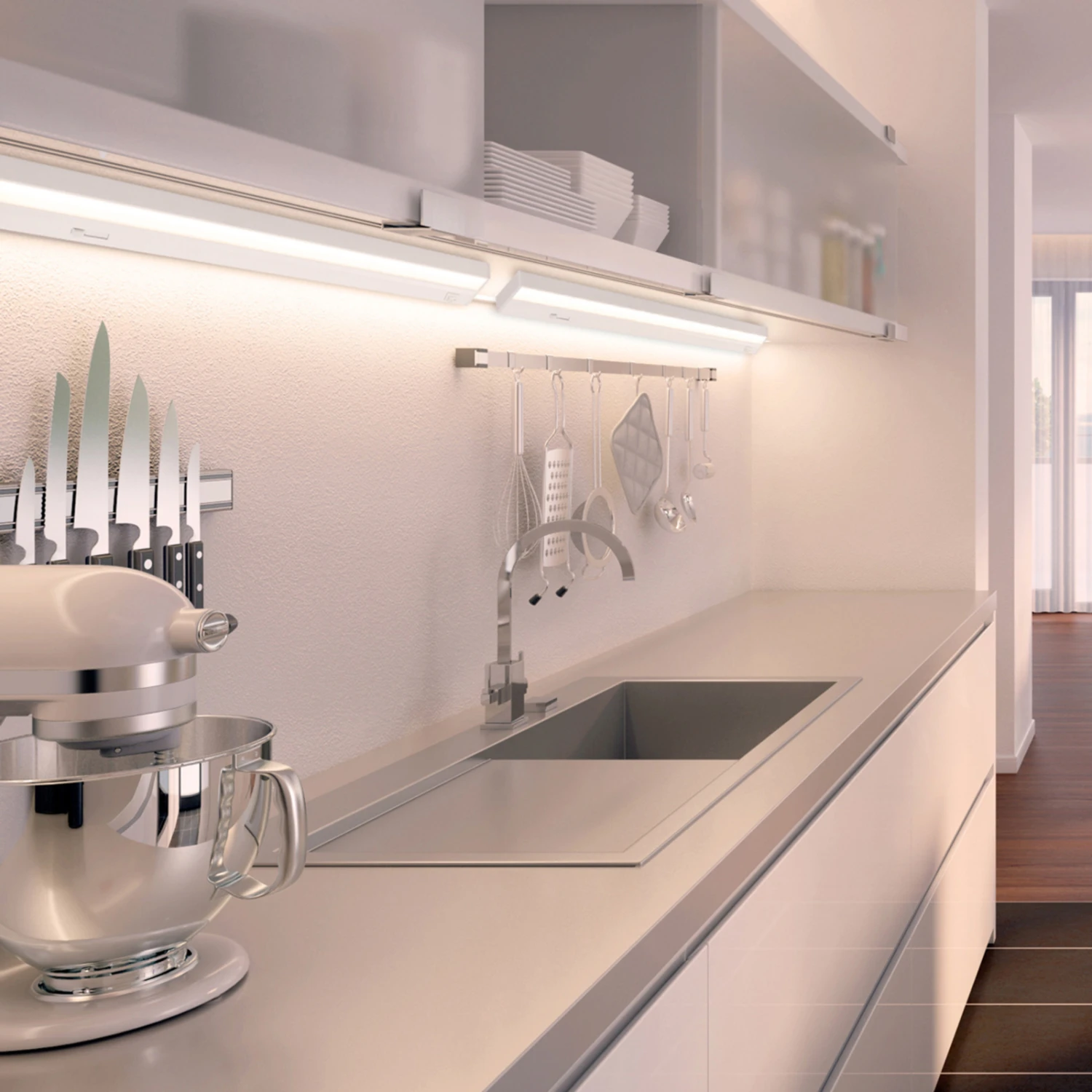 Avec variateur – Lampe LED pour meuble bas Cabinet Light DimLa lampe LED pour meuble bas Cabinet Light Dim permet non seulement d’obtenir un éclairage clair et blanc universel pour travailler sur le plan de travail, mais aussi un éclairage décoratif ou d’orientation confortable et plein d’ambiance dans la cuisine, car la lampe pour meuble bas Cabinet Light Dim est équipée d’un variateur en plus de l’interrupteur, de sorte que l’intensité lumineuse peut être réglée facilement sur la lampe. La livraison comprend un câble de raccordement de 180 cm avec fiche ainsi qu’un câble de connexion avec fiches pour coupler deux lampes.