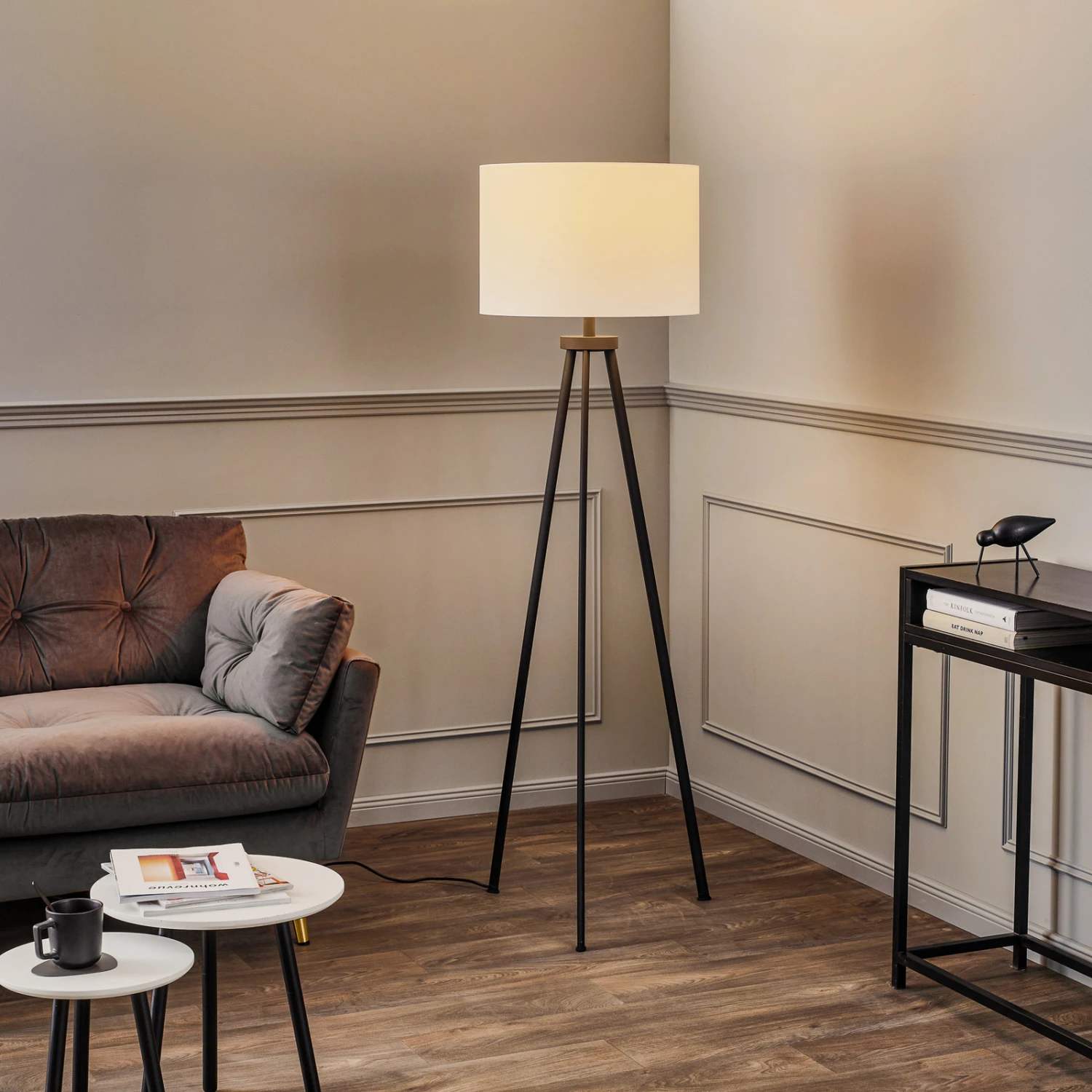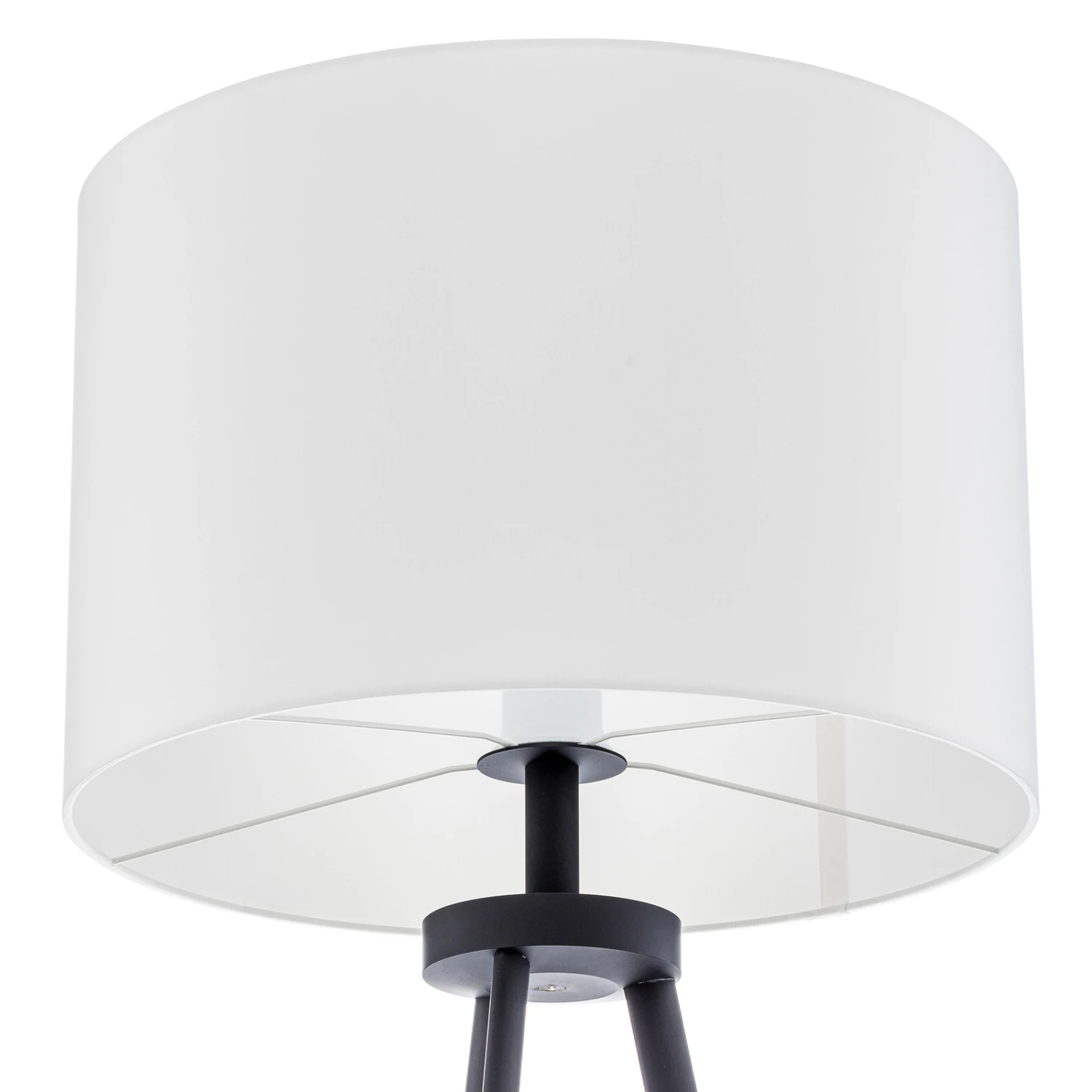 Lampadaire tripode Mayralis avec abat-jour en tissu et structure métallique, à intensité variable en continu et fabriqué en Allemagne