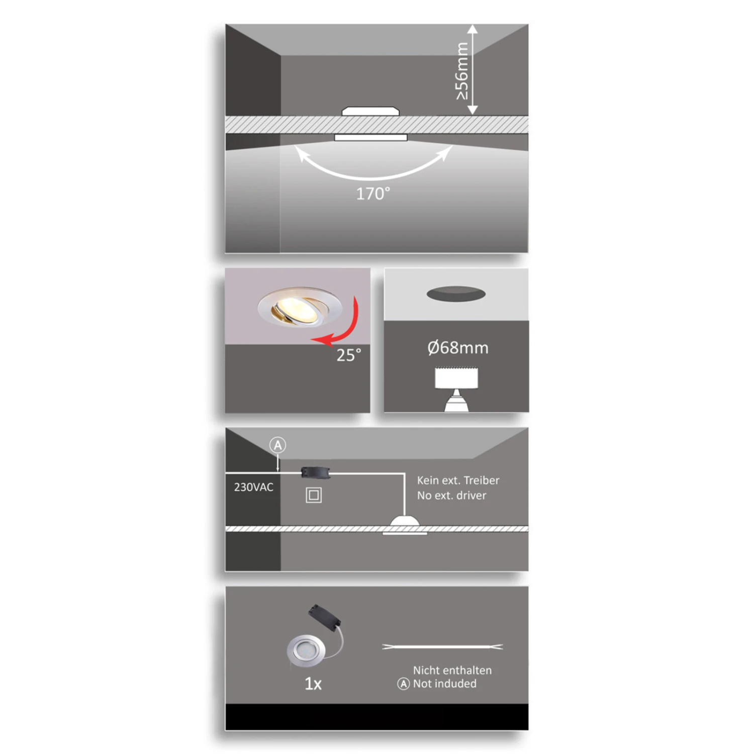 L’anneau intérieur de ce spot encastré chromé qui entoure les LED de couleur blanc chaud est mobile dans sa structure, si bien que l’on peut bénéficier d’un éclairage qui possède une grande flexibilité dans la pièce. Le logement peut être pivoté des deux côtés sur 25 degrés. La surface chromé brillant donne une impression d’élégance particulière, et elle s’intègre bien à tous les intérieurs modernes, alors que la technologie LED dont bénéficie ce spot encastré chromé est très contemporaine car elle garantit un éclairage de qualité et une faible consommation en électricité.