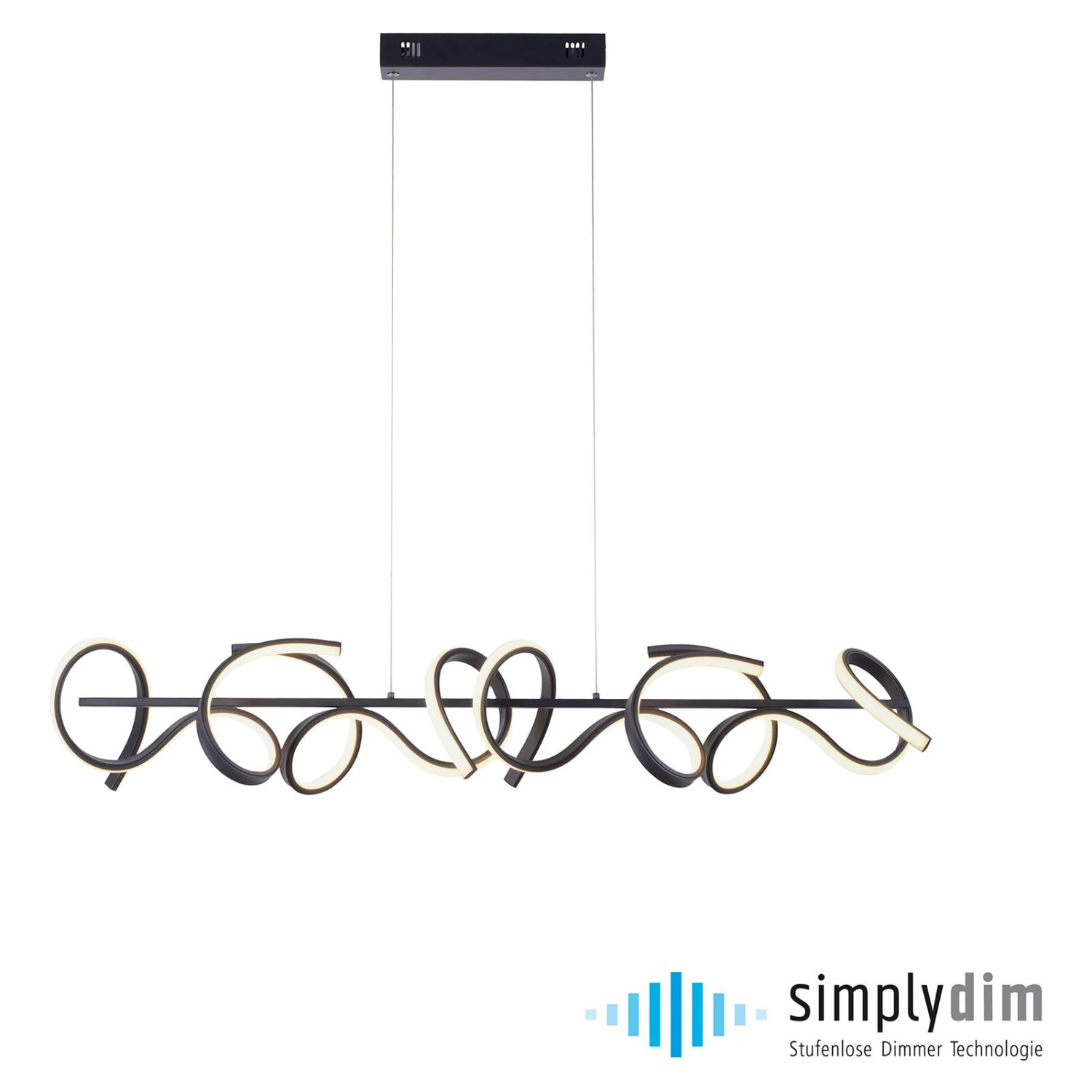 Les LED sont installées sous forme de bandes lumineuses dans les quatre éléments courbes qui s’enroulent autour de la tige horizontale et rigide. Cela permet à la lumière de pénétrer dans toutes les directions et d’éclairer doucement la pièce. De plus, la lampe suspendue est équipée de la technologie Simply Dim. Cette fonction de gradation permet de régler en continu la luminosité de la lampe à l’aide d’un interrupteur existant, qu’il soit à bascule, à traction, à cordon ou mural. La fonction de mémoire enregistre le dernier réglage de luminosité jusqu’à la prochaine mise en marche de la lampe.