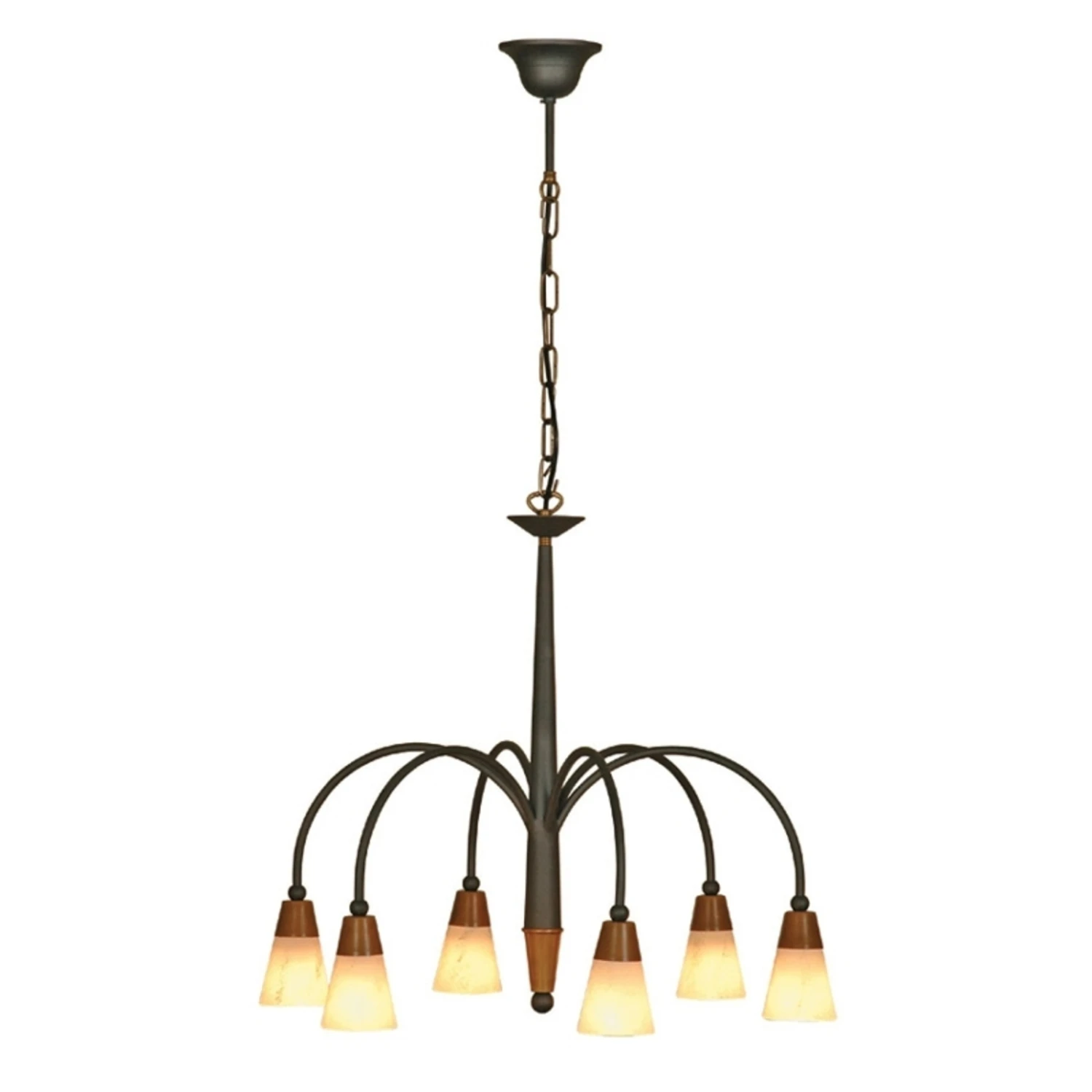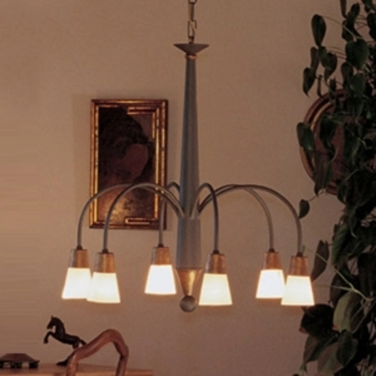 Grâce à sa forme et à sa couleur exceptionnelles, la suspension STELLA a un effet tout particulier. 6 bras recourbés sont fixés tout autour de la partie centrale peinte de couleur plomb. Des boules viennent adoucir le design. Le boîtier de fixation et les bras sont peints couleur plomb. Les fixations des diffuseurs et plusieurs éléments de décoration ont été colorées en laiton antique et forment un beau contraste avec la structure de couleur plomb et les diffuseurs en verre scavo couleur crème. La suspension STELLA est idéale pour des salles à manger rustiques ou de grands halls d’entrée.
