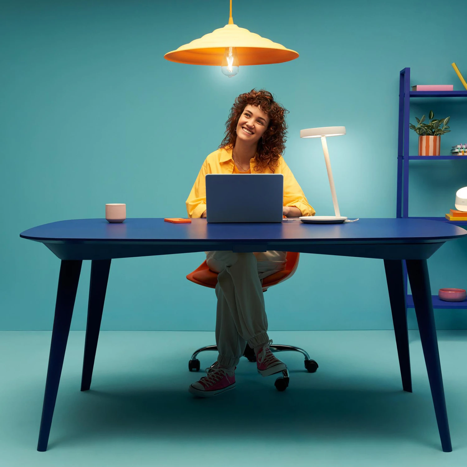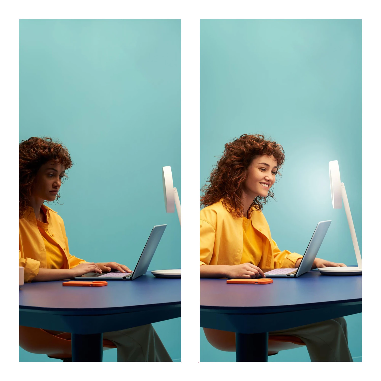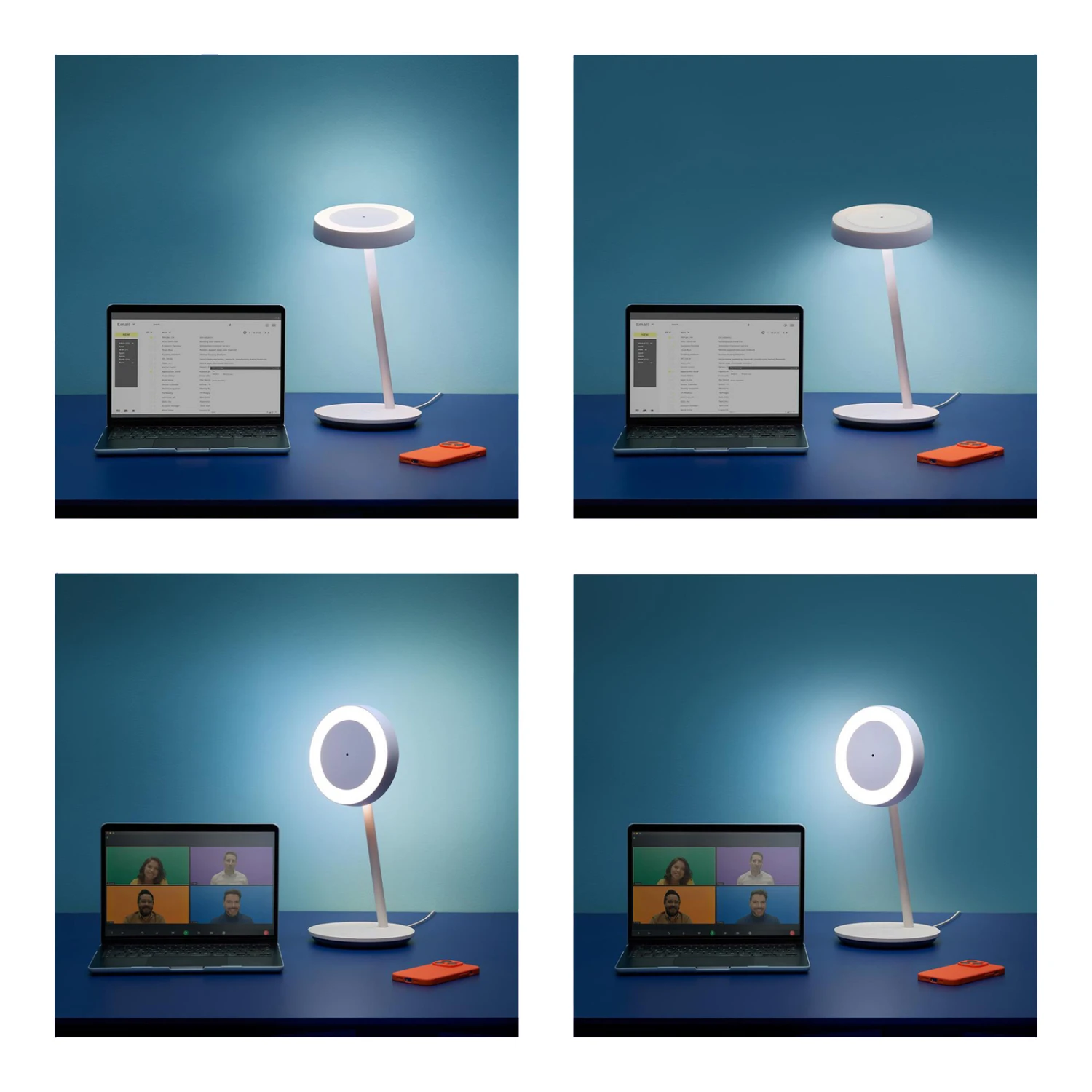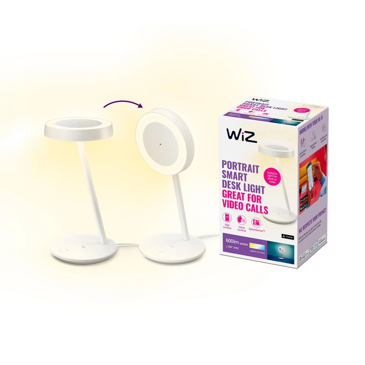 Dimmable et avec fonction CCT : lampe de bureau LED intelligente Portrait avec éclairage circulaire, WLAN, USB, Ra90 La lampe de bureau LED intelligente Portrait avec éclairage circulaire de WiZ est commandée par une application gratuite via une connexion WLAN. Différents modes d’éclairage sont disponibles pour travailler ou pour créer une ambiance chaleureuse. En inclinant la lampe, l’éclairage circulaire s’active automatiquement, par exemple pour les vidéoconférences. Portrait apporte une lumière intelligente dans tous les espaces de vie, que ce soit pour un travail ciblé sur le bureau dans la salle de travail ou sur les buffets et les tables d’appoint pour une ambiance confortable dans la chambre à coucher ou le salon. Différentes possibilités sont disponibles pour l’allumage et la gradation : la commande peut se faire aussi bien par le toucher via les touches intégrées que par l’application ou par commande vocale (Amazon Alexa, Apple Siri ou Google Assistant). Grâce à la fonction de changement de couleur CCT, la lumière principale variable fournit en outre 65.000 nuances de blanc différentes pour chaque situation. Un capteur pour l’activation automatique à l’approche est également intégré et Portrait est également compatible avec le standard Matter. L’application permet de commander la lumière à la maison même en déplacement et de définir des horaires. Cette combinaison moderne de lampe de table et d’éclairage annulaire est alimentée par USB-C et peut donc être facilement connectée à un ordinateur portable ou à un PC. La lampe de table LED intelligente Portrait avec éclairage annulaire est un excellent éclairage pour les selfies, pour le streaming ou pour les vidéoconférences. Elle peut également être utilisée comme lampe de table moderne à commande intelligente. Caractéristiques techniques / Compatibilité – intégration via WLAN ; pas de pont ou de passerelle nécessaire – commande par smartphone ou tablette via l’application WiZ pour iOS et Android sur place ou en déplacement (connexion Internet nécessaire) – commande vocale possible (Google Home, Amazon Alexa ou Apple Siri) – alternativement, commande manuelle via les boutons du pied – commande supplémentaire possible avec la télécommande WiZ (voir accessoires) – fonction CCT avec 65.000 nuances de blanc (2.700 – 6.500 K) – dimmable – très bon rendu des couleurs (CRI>90) – fonctionnement via USB-C – inclinable – utilisable comme lampe annulaire ou lampe de table moderne – certifiée Matter – capteur pour une commutation automatique à l’approche – bonne résistance à la commutation : 50.000 cycles de commutation